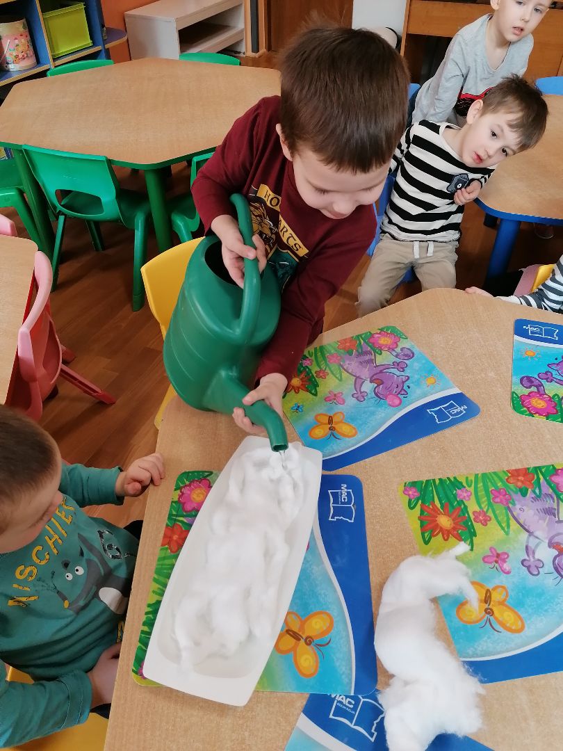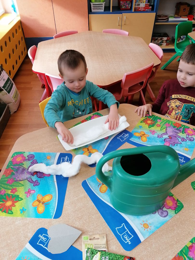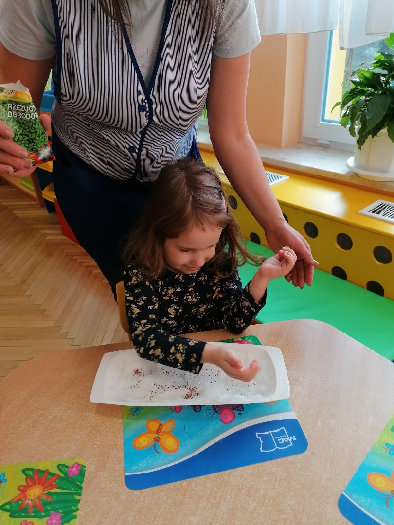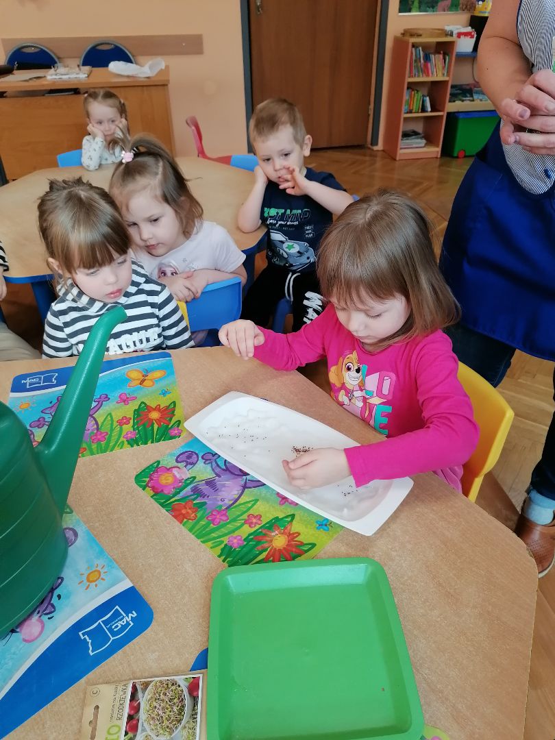 Tygryski postanowiły założyć w sali zielony ogródek. Zgromadziliśmy potrzebne przybory, ziemię i nasiona.Przed przystąpieniem do pracy dzieci poznały warunki potrzebne roślinom do wzrostu.Następnie sieliśmy rzeżuchę, kiełki rzodkiewki oraz sadziliśmy cebulki na szczypiorek.Po zasianiu i podlaniu rośliny zostały umieszczone na parapecie na słoneczku, a dzieci muszą pamiętać o ich podlewaniu i obserwowaniu wzrostu; kiedy wyrosną będą źródłem witamin na naszych kanapkach.