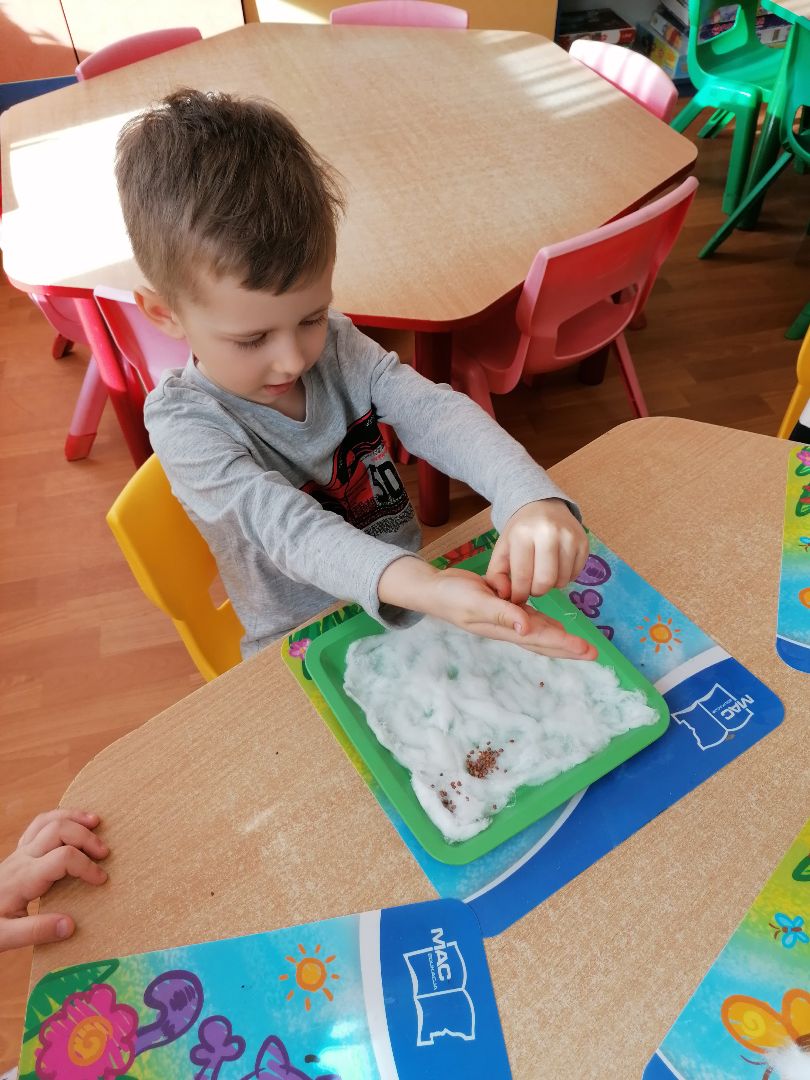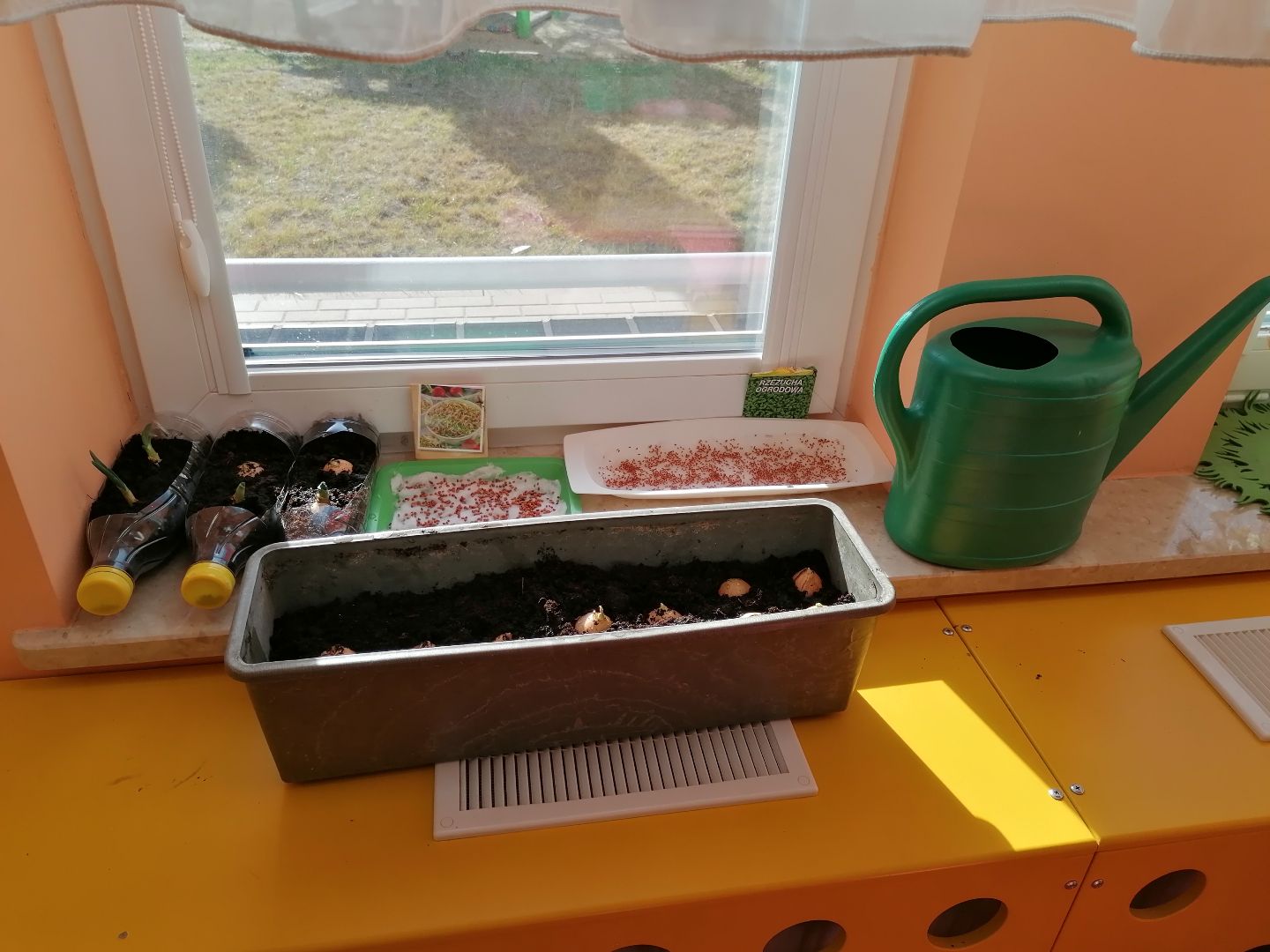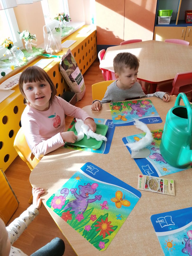 Tygryski postanowiły założyć w sali zielony ogródek. Zgromadziliśmy potrzebne przybory, ziemię i nasiona.Przed przystąpieniem do pracy dzieci poznały warunki potrzebne roślinom do wzrostu.Następnie sieliśmy rzeżuchę, kiełki rzodkiewki oraz sadziliśmy cebulki na szczypiorek.Po zasianiu i podlaniu rośliny zostały umieszczone na parapecie na słoneczku, a dzieci muszą pamiętać o ich podlewaniu i obserwowaniu wzrostu; kiedy wyrosną będą źródłem witamin na naszych kanapkach.
