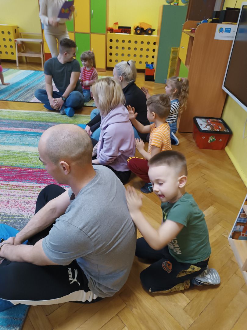 Dzieci z Rodzicami stworzyły piękne stroiki wielkanocne a na koniec wszyscy bawiliśmy się z wykorzystaniem chusty animacyjnej.