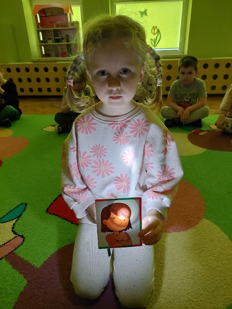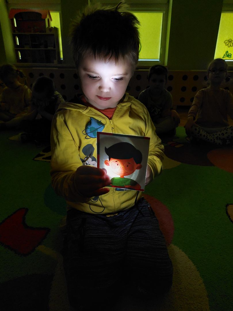 Emocje są bardzo ważne w życiu człowieka, ponieważ każdego dnia odczuwamy je w różnych sytuacjach. Dziś Puchatki miały okazję poćwiczyć rozpoznawanie uczuć w nietypowy sposób. Dzieci podświetlały latarką karty, na których ukazywały się różnorodne miny. Od teraz rozróżnianie emocji przyjemnych i nieprzyjemnych to dla Puchatków łatwe zadanie.