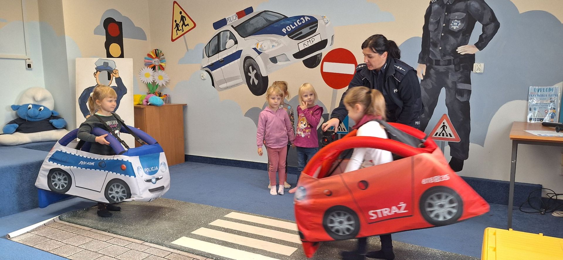 Jesień to bardzo dobra pora na przypomnienie zasad bezpiecznego poruszania się w drodze do przedszkola. Dlatego też Puchatki wybrały się z wizytą na Komisariat Młodego Policjanta, czyli pokój profilaktyczny Komendy Miejskiej Policji w Białymstoku. Przedszkolaki pod opieką pani aspirant Marty Gawieńczyk zapoznały się z umundurowaniem funkcjonariusza policji, dowiedziały się czym zajmuje się policja oraz kto pomaga policjantom w pracy - oczywiście psy. Dzieci wzięły udział w praktycznych ćwiczeniach przejścia po oznakowanym przejściu dla pieszych wyposażonym w sygnalizator świetlny. Podczas wesołej zabawy w "Koło fortuny" utrwaliły swoją wiedzę z zakresu bezpieczeństwa. Na koniec przećwiczyły postawę "żółwia" na wypadek spotkania z agresywnym psem oraz utrwaliły numery: na policję i numer alarmowy 112.