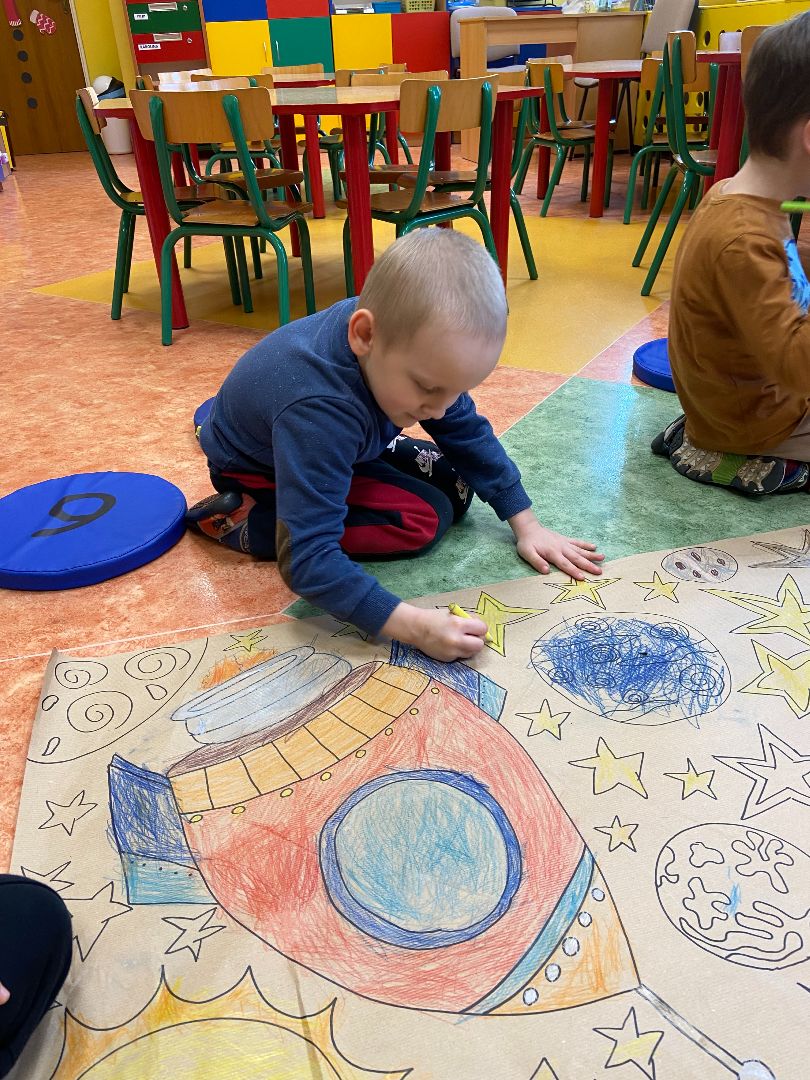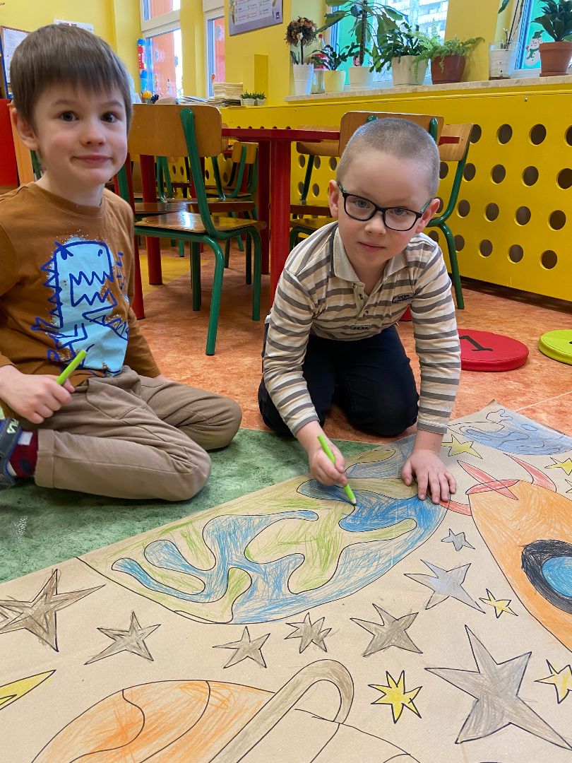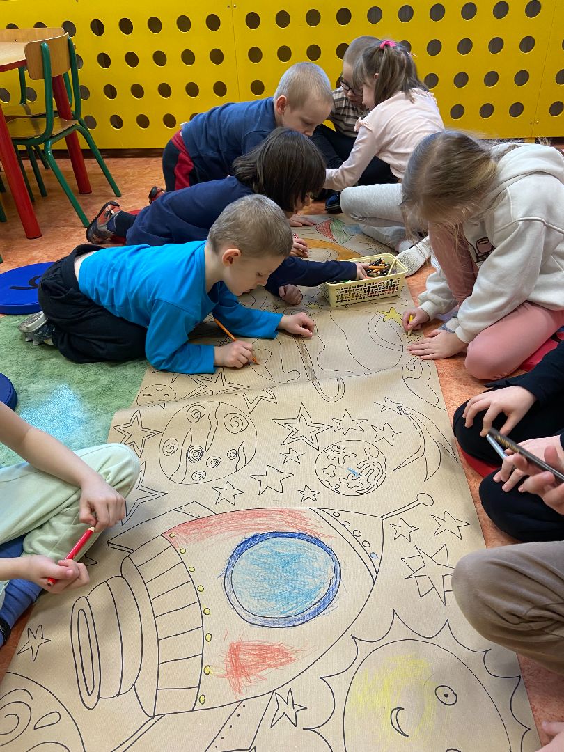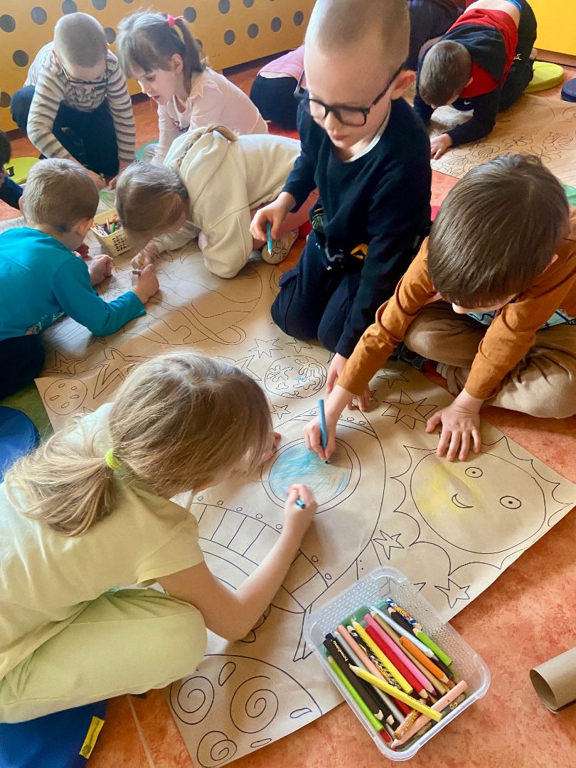 Każdy dorosły wie, jak ważna w życiu codziennym jest umiejętność współpracy. Wczoraj w ramach zajęć popołudniowych Kłapouszki miały za zadanie pokolorować wspólną kolorowankę. Podczas tego zadania dzieci modły doskonalić umiejętności w zakresie pracy motoryki małej. Odbyły się również zabawy integracyjne, które pokazały nam, kto w naszej grupie ma cechy przywódcze, a także umiejętność rozplanowania zadań. To było ciekawe doświadczenie.