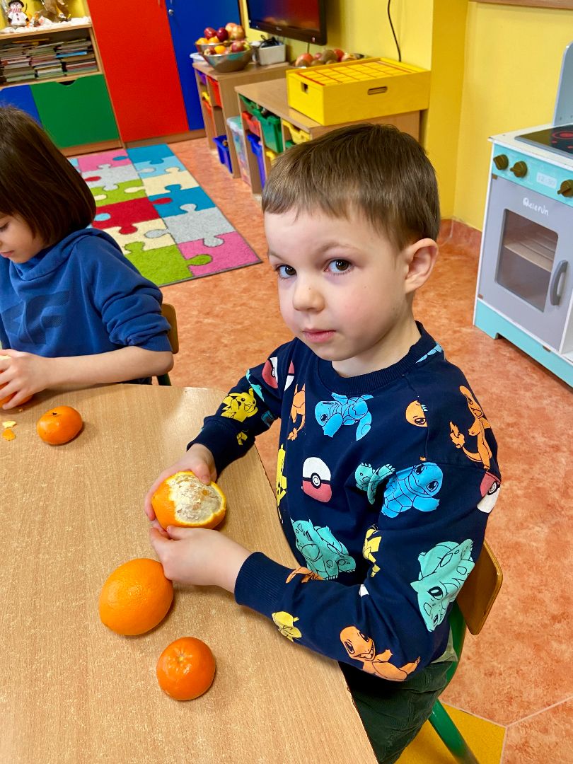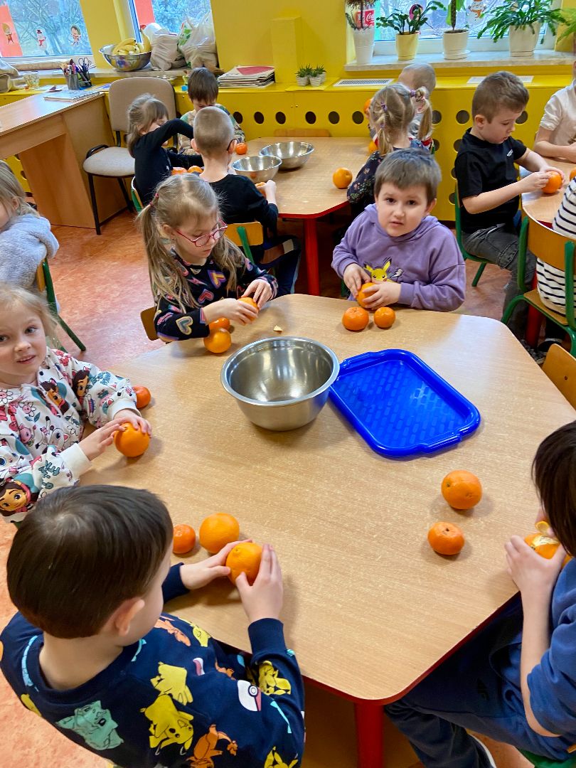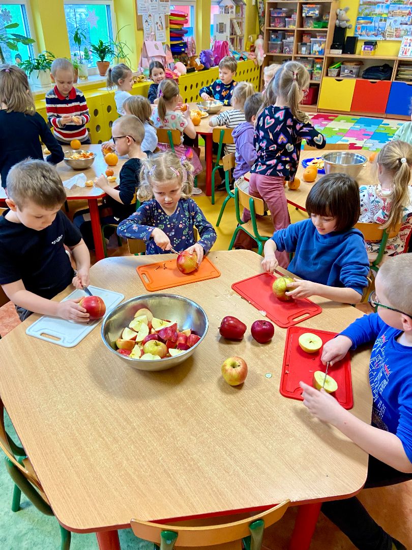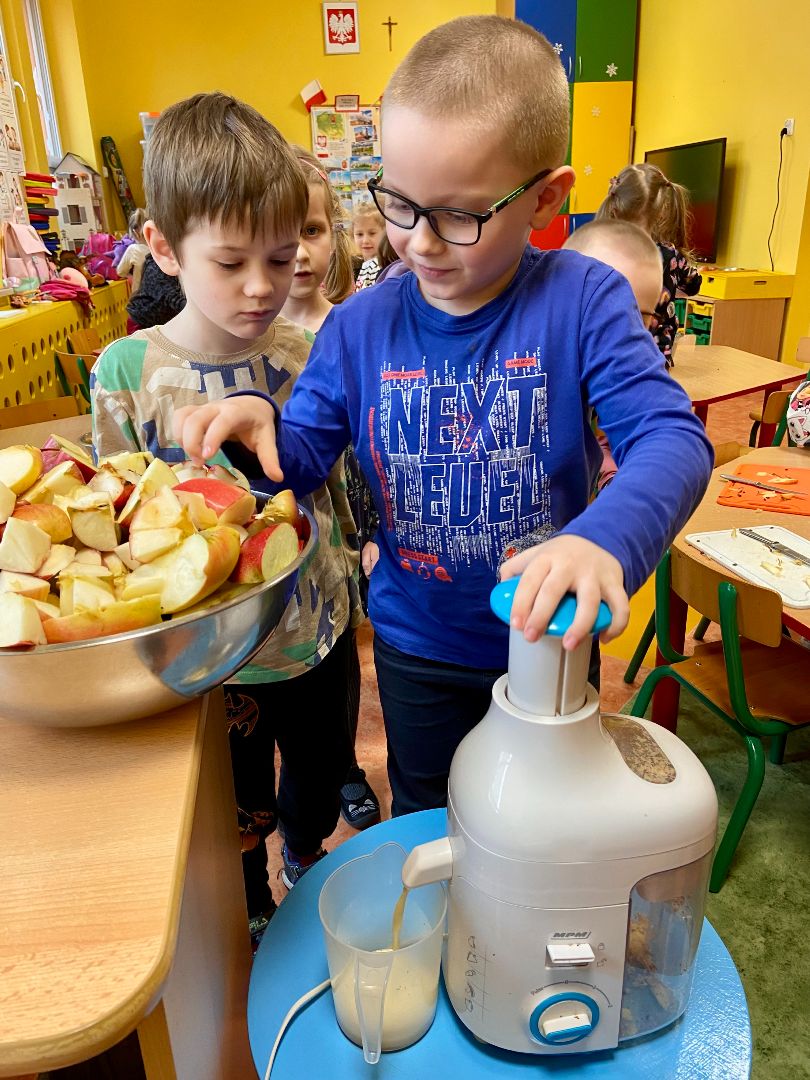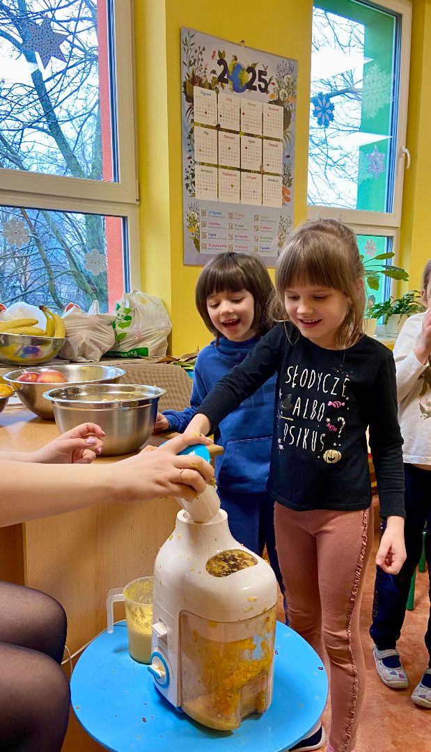 28.02.2025 r. Kłapouszki zrobiły pyszny i zdrowy sok. Dzieci miały za zadanie obrać i pokroić owoce, a następnie wrzucić do sokowirówki, z której poleciał pyszny napój. Zadanie to miało na celu zachęcenie dzieci do próbowania zdrowych przekąsek. Kłapouszki chętnie uczestniczyły w przedsięwzięciu. Dzięki temu zrozumiały, że współpracując praca nie jest aż tak trudna, ponieważ wykonują ją razem. Zadanie wywołało wiele uśmiechów, co uwieczniły zdjęcia.