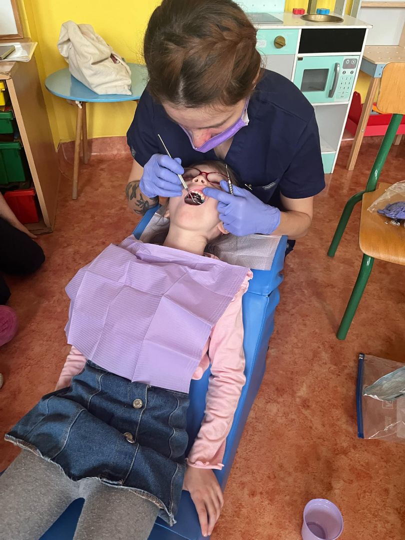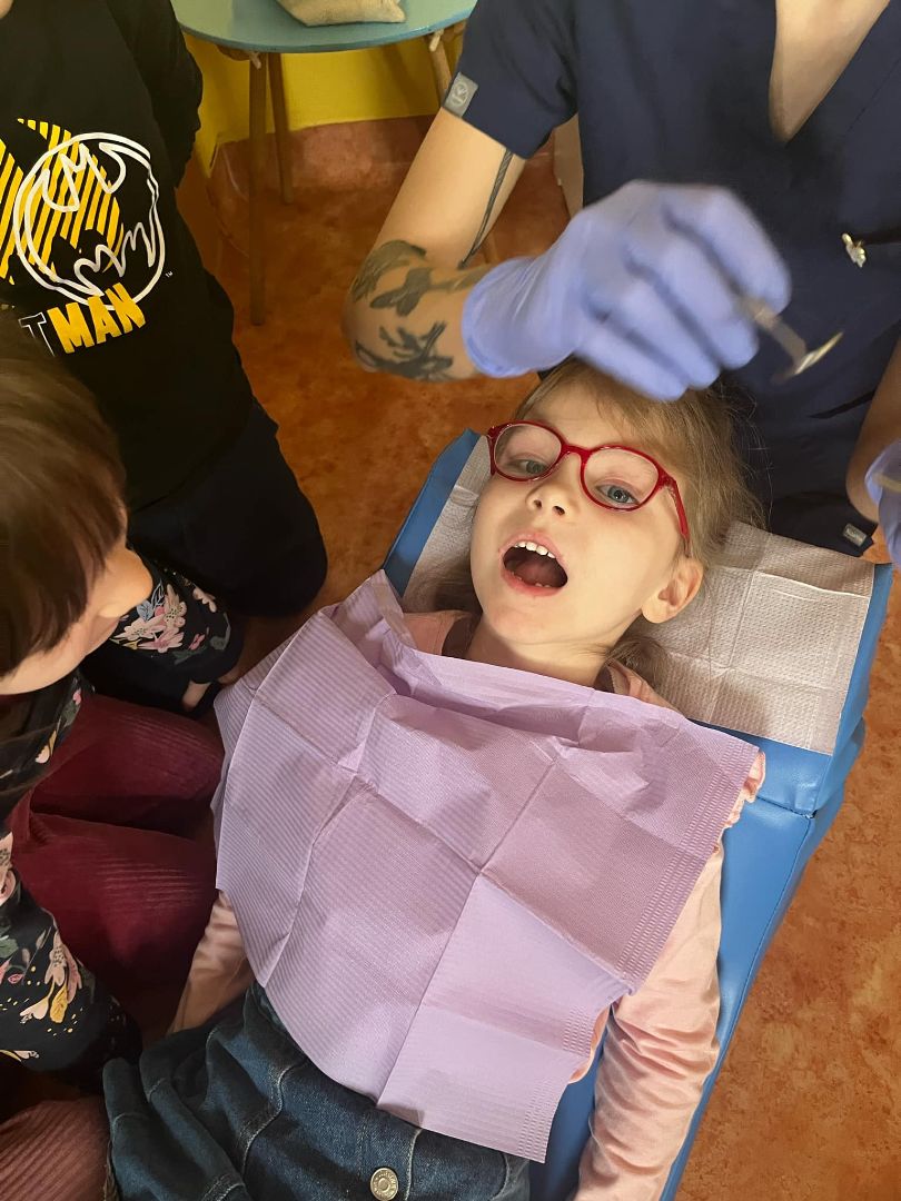 12.03.2025 r. grupę Kłapouszków odwiedziła mama Oli, która z zawodu jest dentystką. Opowiedziała nam o swoim zawodzie, pokazała w jaki sposób zakłada się plombę, a także w jaki sposób dbać o zdrowie zębów. Pani Iza pokazała dzieciom, że strach ma wielkie oczy, a wizyta u dentysty może przebiegać w miłej atmosferze. Serdecznie dziękujemy za zaangażowanie.