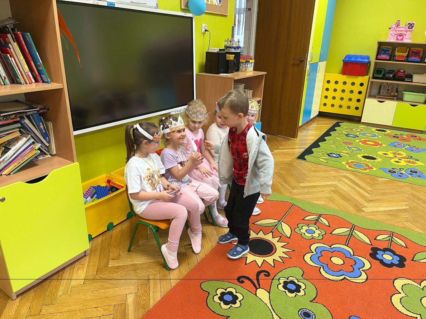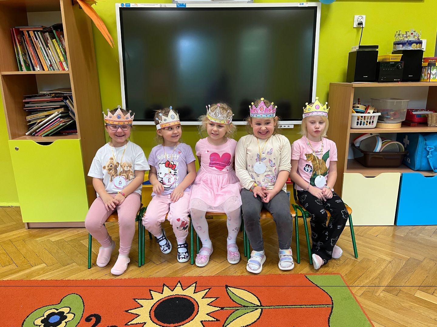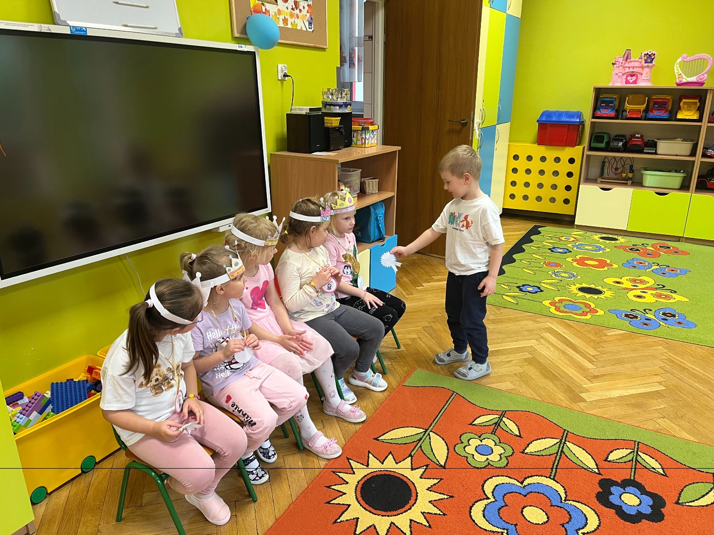 Na początku dziewczynki własnoręcznie wykonały piękne bransoletki, a następnie ozdabiały korony, w których wyglądały jak prawdziwe królewny. 👑✨ Chłopcy również spisali się na medal – dosłownie! Wykonali dla swoich koleżanek medale, które później z dumą im wręczyli, składając serdeczne życzenia. Na zakończenie dnia wszyscy wspólnie bawili się przy wesołej muzyce i tańcach – pełnych uśmiechu, przyjaźni i dobrej zabawy! 🎶💃🕺 To był naprawdę wyjątkowy dzień w naszej grupie! 💕