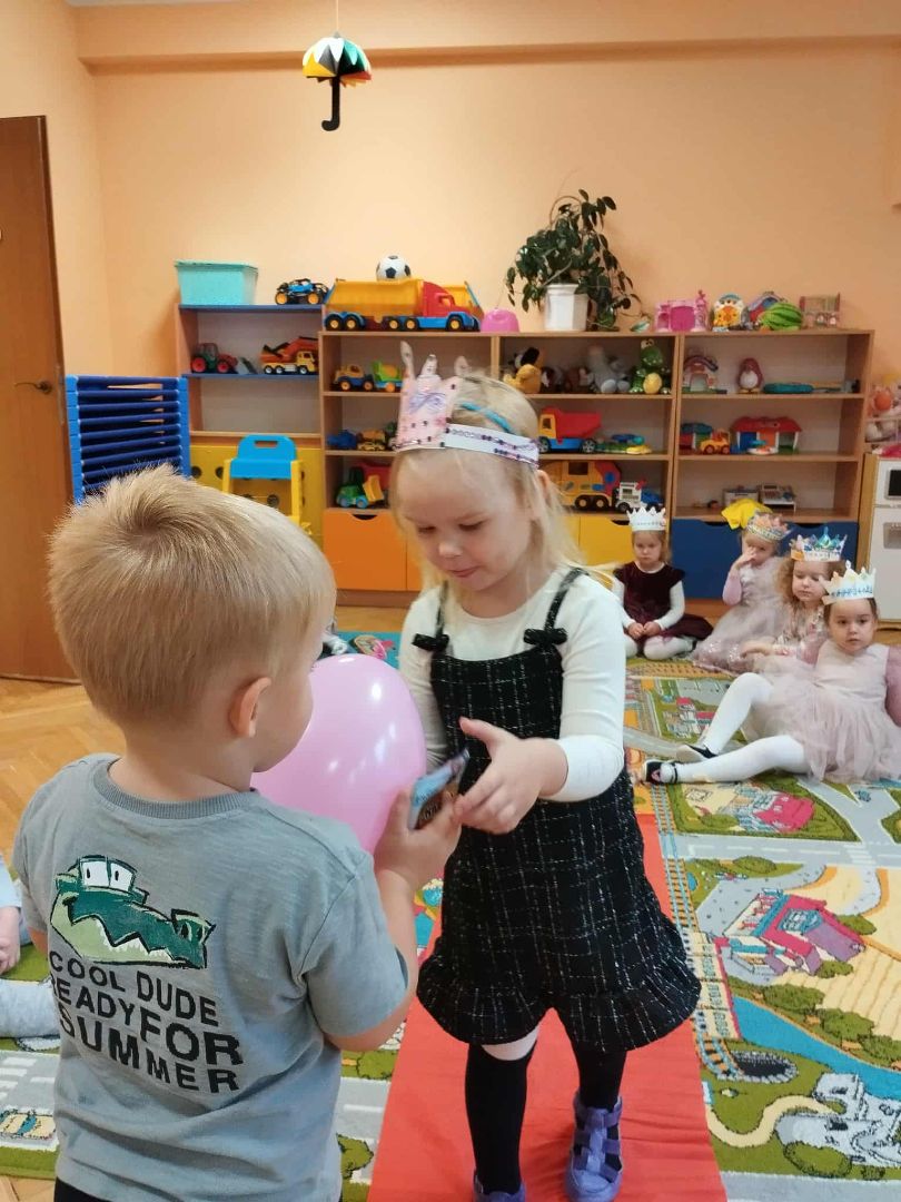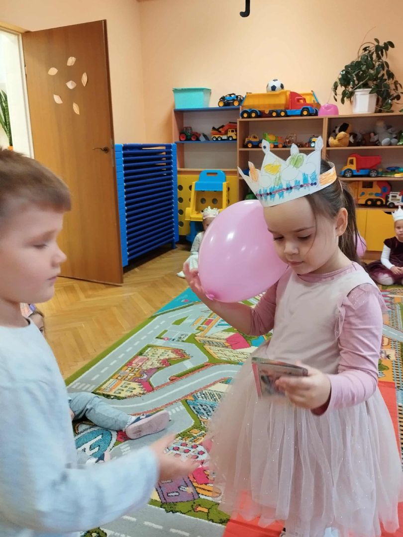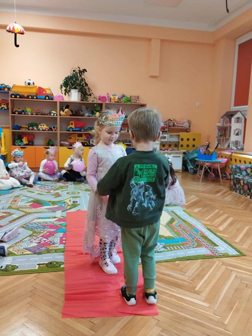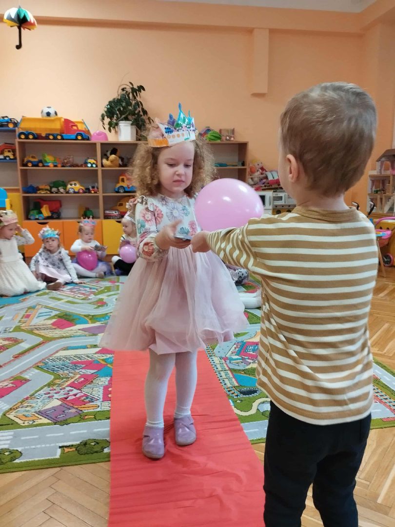 W dniu 10.10.2025 r w piątek świętowaliśmy w naszej grupie Dzień Dziewczynki. Nasze królewny założyły suknie i prezentowały się kolegom na czerwonym dywanie. Odbył się bal z balonami przy muzyce. Każda królewna otrzymała upominek, miała też na głowie własnoręcznie zrobioną koronę. Na koniec dnia dziewczynki otrzymały kwiatowe klocki , którymi bawiły się z kolegami. To był dzień integracji i tworzenia dobrych relacji między dziećmi.