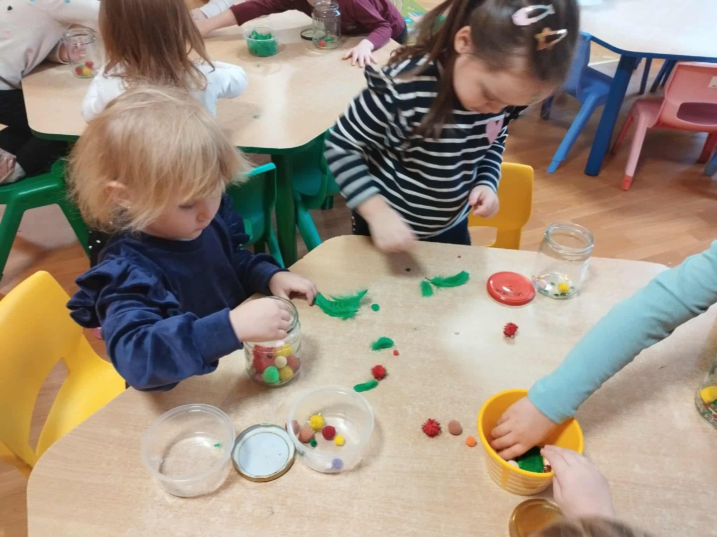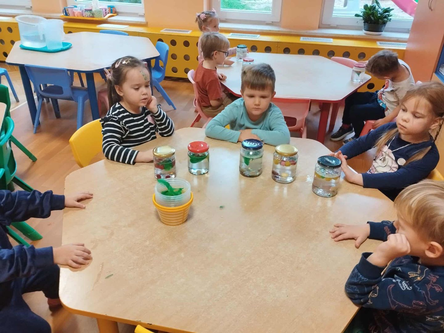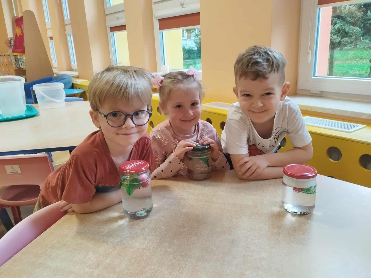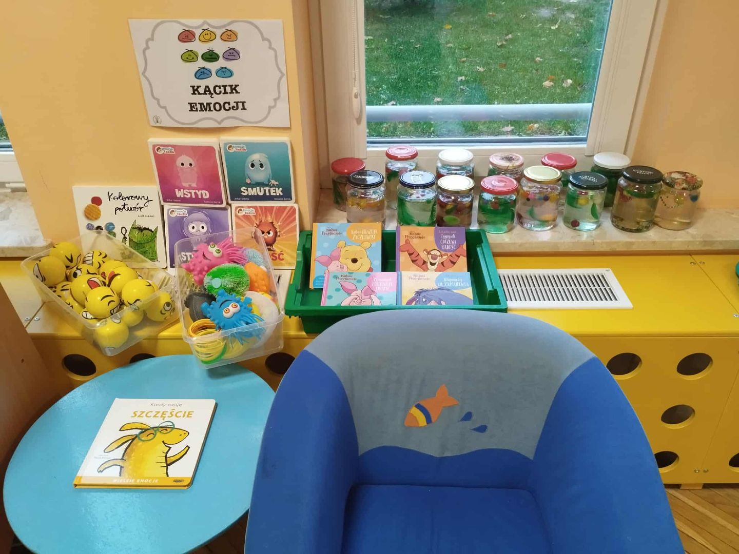 W naszej grupie, przy pomocy rodziców powstał kącik emocji. Celem jego jest rozpoznawanie i nazywanie uczuć dzieci, umiejętność radzenia sobie z trudnymi emocjami i rozładowanie trudnych emocji. Dzieci stworzyły własne słoiki emocji, które pomagają im się wyciszyć i uspokoić.