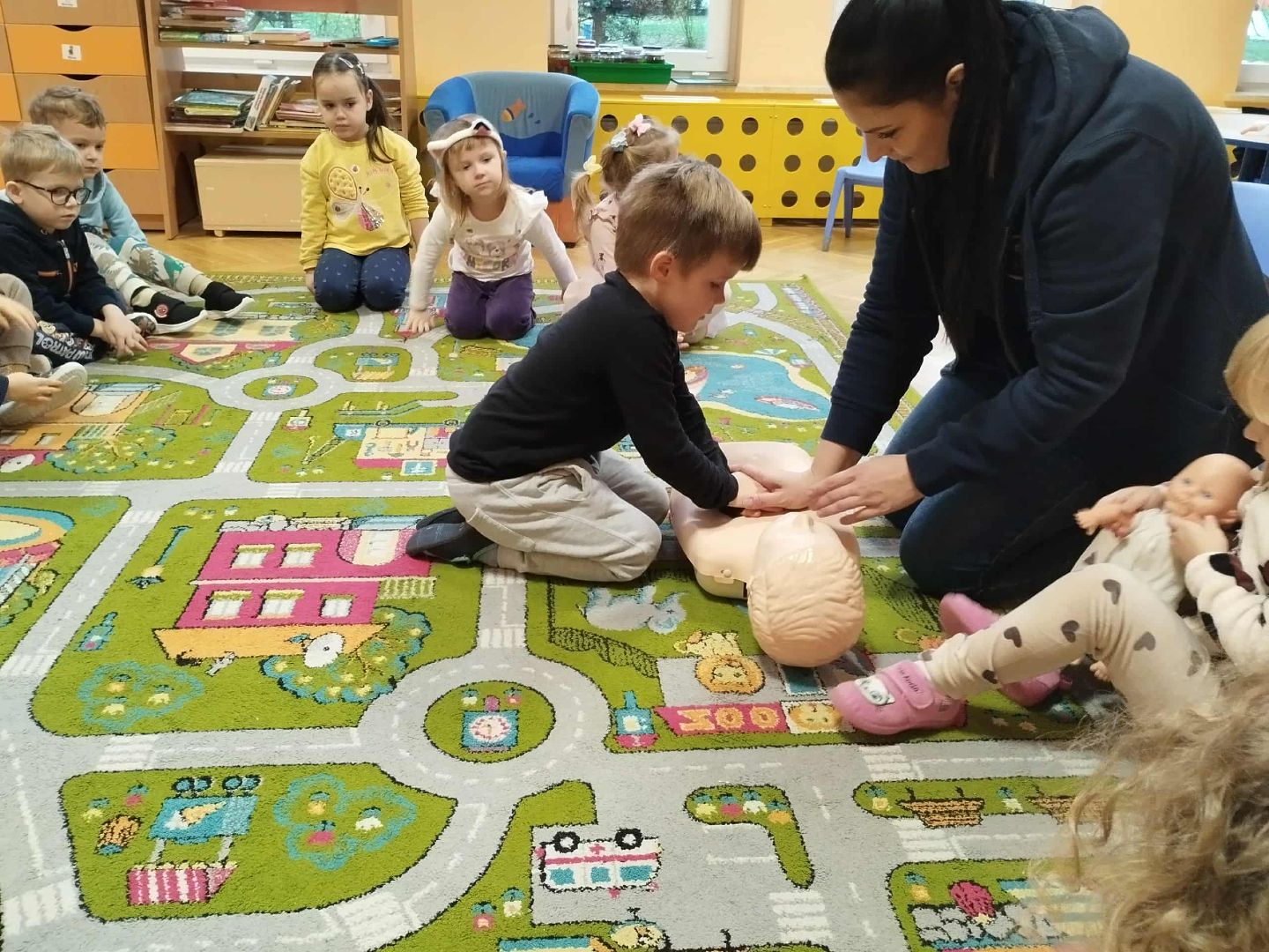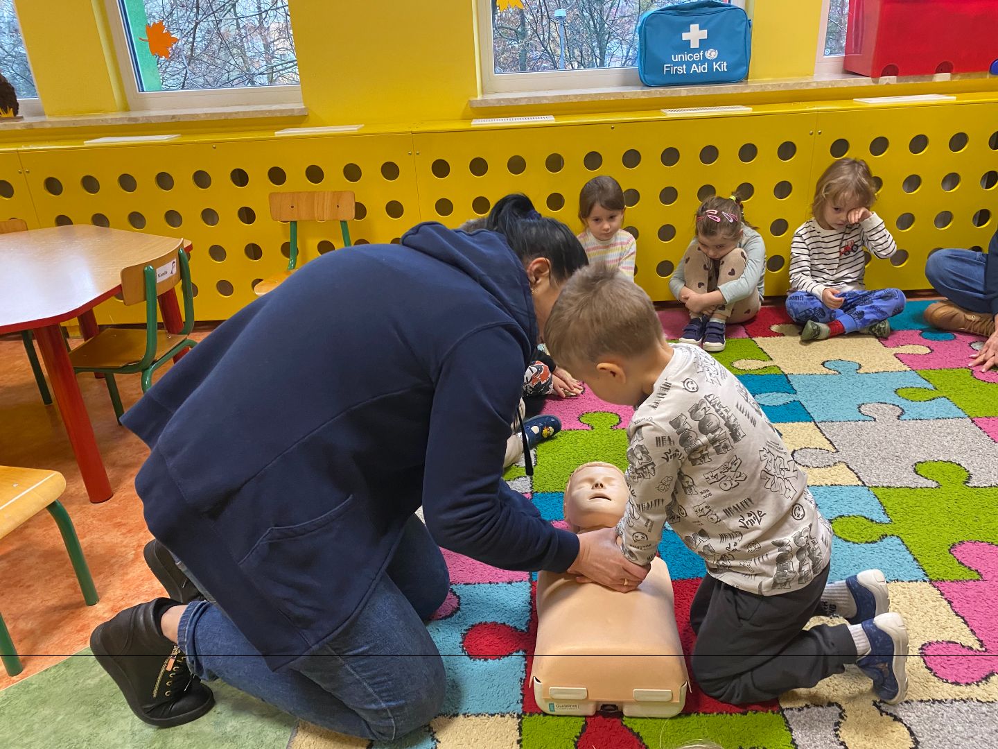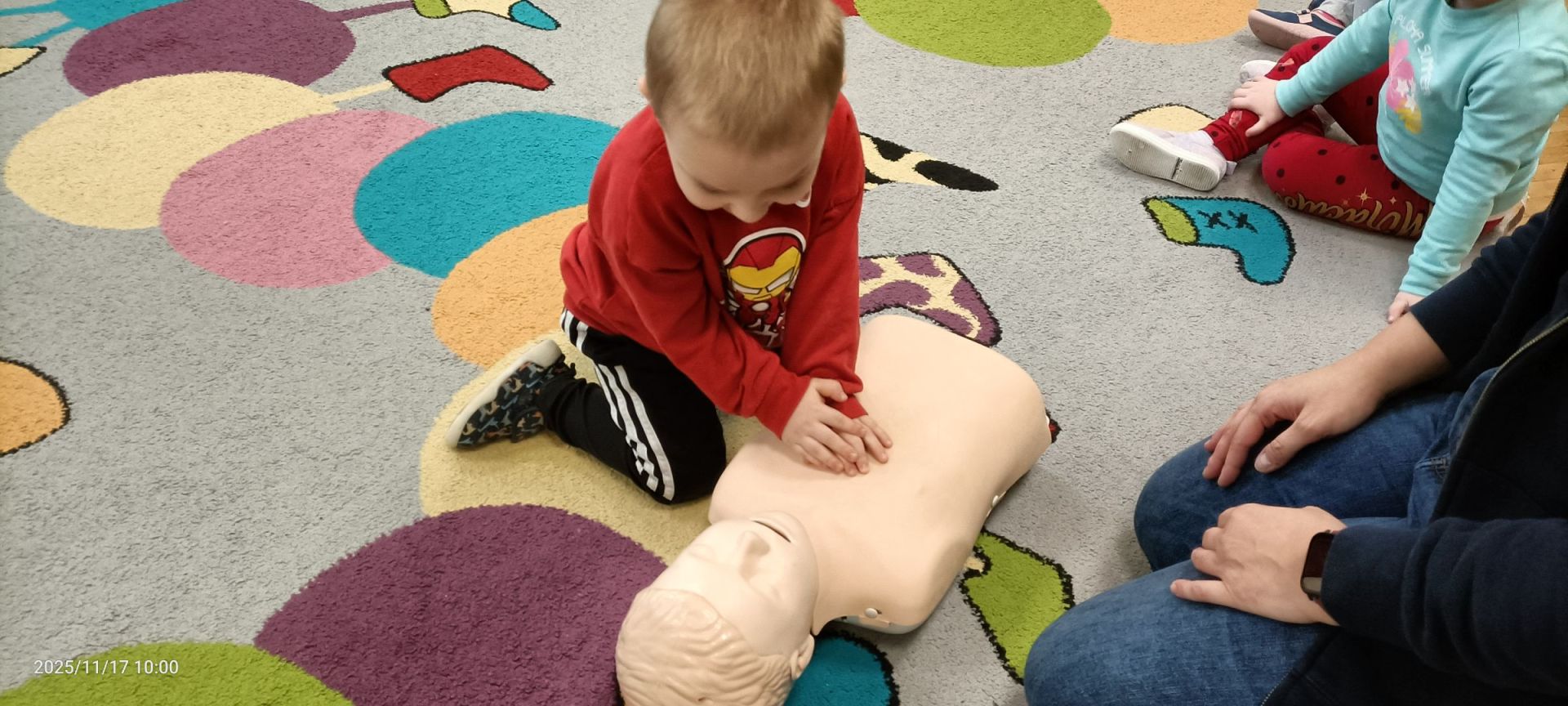 Kolejnym etapem zajęć była część praktyczna dotycząca podstaw udzielania pierwszej pomocy. Dzieci, pod okiem instruktorów, miały możliwość ćwiczenia na specjalnych fantomach. Z wielkim zaangażowaniem uczyły się, jak sprawdzić oddech, w jaki sposób prawidłowo wezwać pomoc oraz jak wykonać podstawowy masaż serca. Instruktorzy w przystępny i spokojny sposób tłumaczyli kolejne kroki, a dzieci chętnie podejmowały próby wykonania prostych czynności ratowniczych.