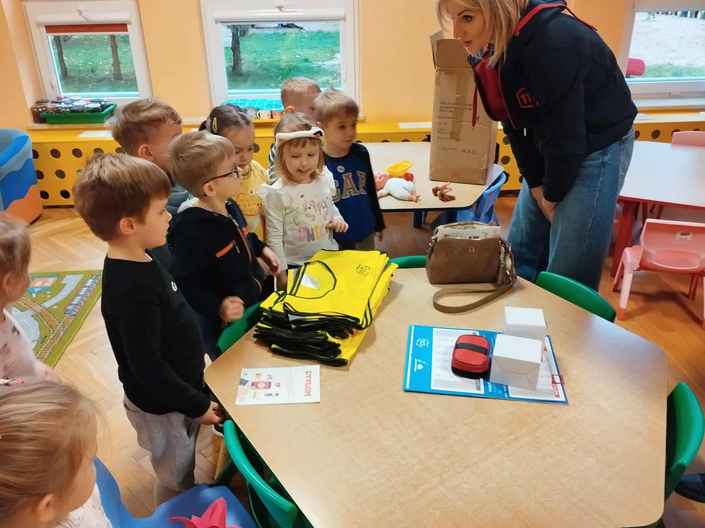 Na zakończenie zajęć panie z Centrum Powiadamiania Ratunkowego wyposażyli nasze przedszkole w kamizelki odblaskowe dla każdego przedszkolaka.