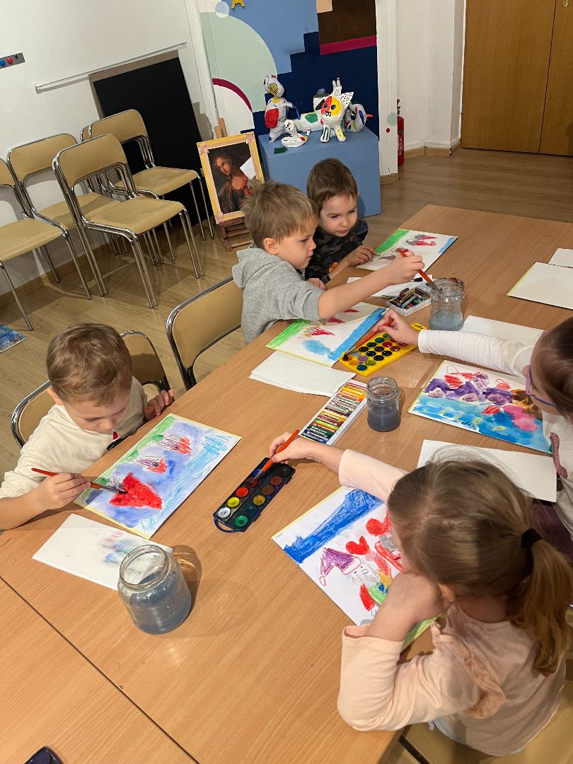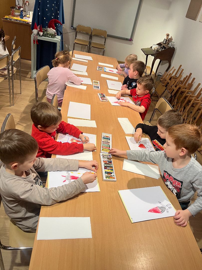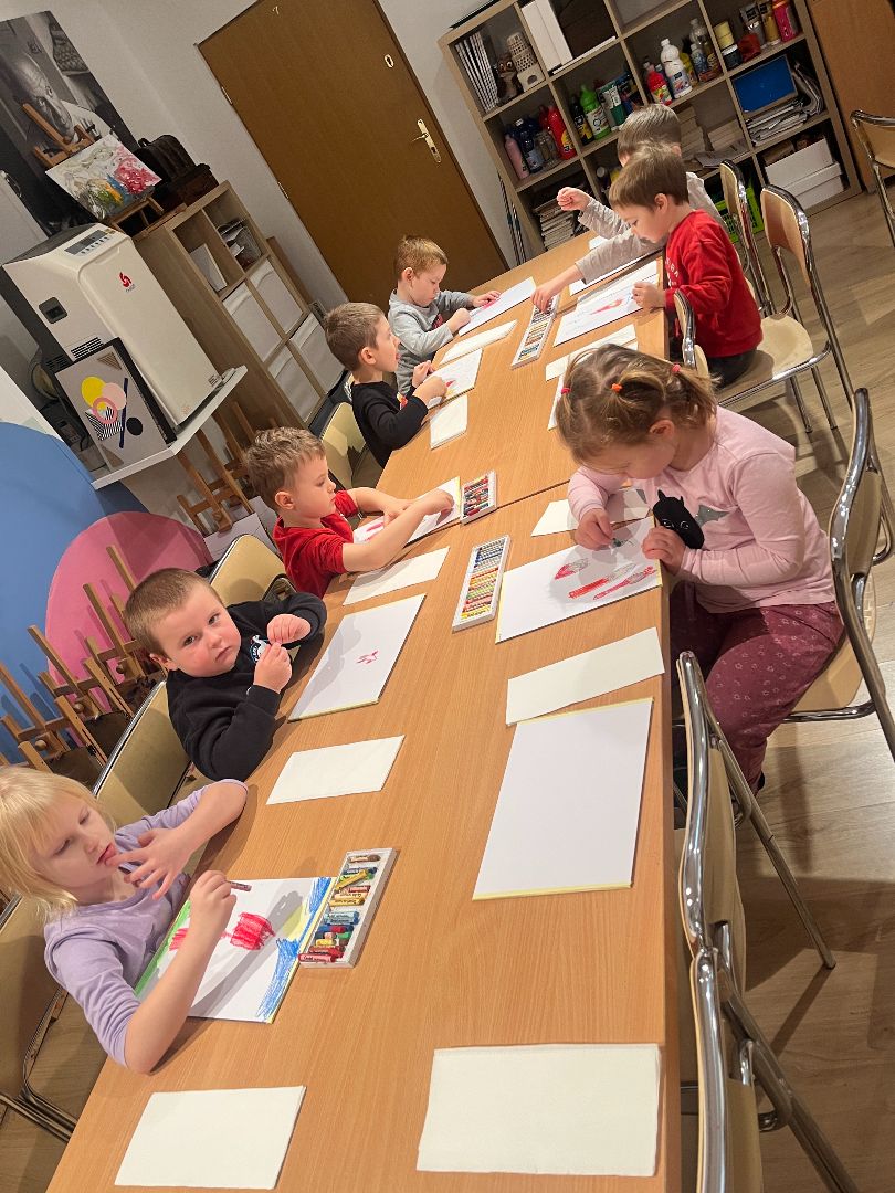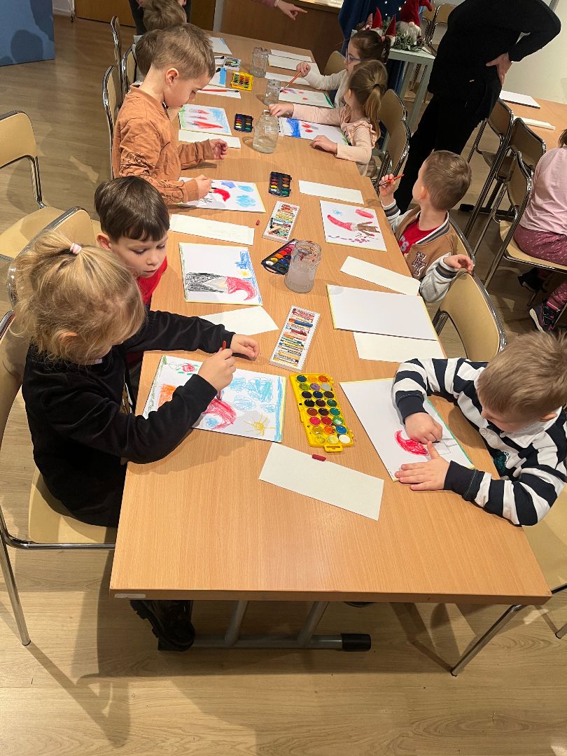 W czwartek dzieci odwiedziły ratusz, gdzie wzięły udział w swoim już trzecim spotkaniu artystycznym. Tym razem poznały, jak powstają pastele oraz farby suche. Po krótkim wprowadzeniu dzieci rozpoczęły pracę twórczą: najpierw rysowały pastelami świąteczne krasnale, a następnie tworzyły tło przy użyciu farb suchych. Powstały ciekawe, zimowe prace, a samo wyjście było dla dzieci okazją do rozwijania nowych umiejętności plastycznych.