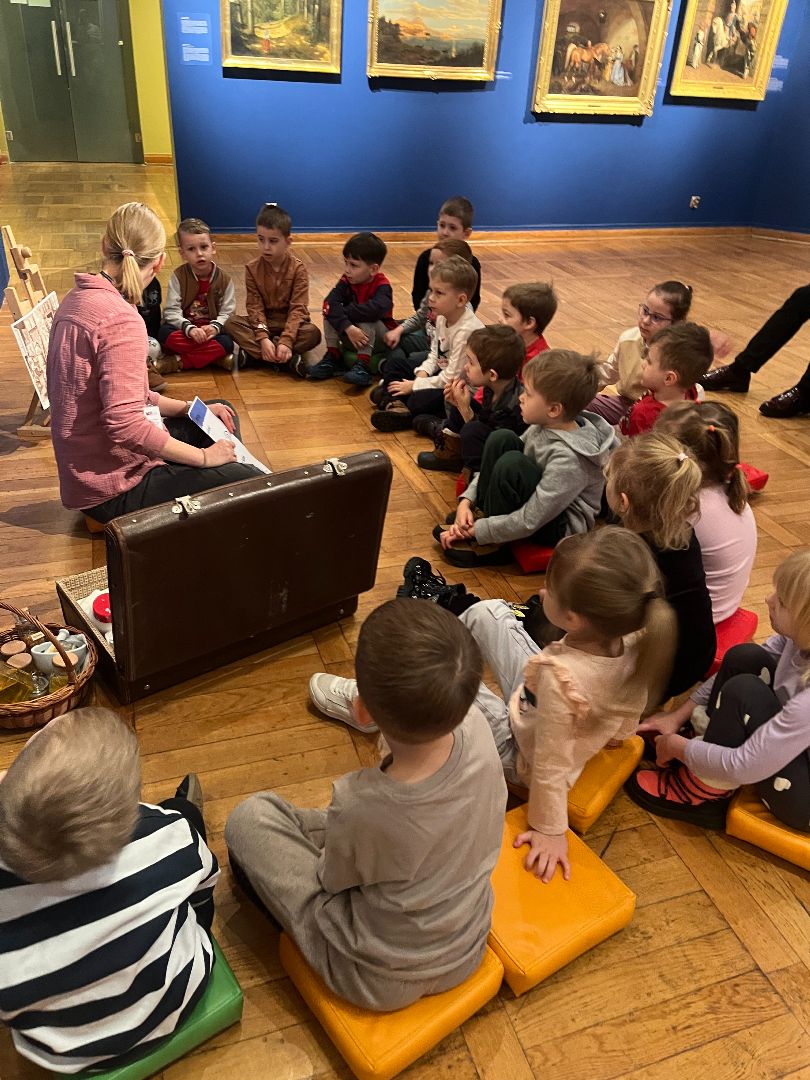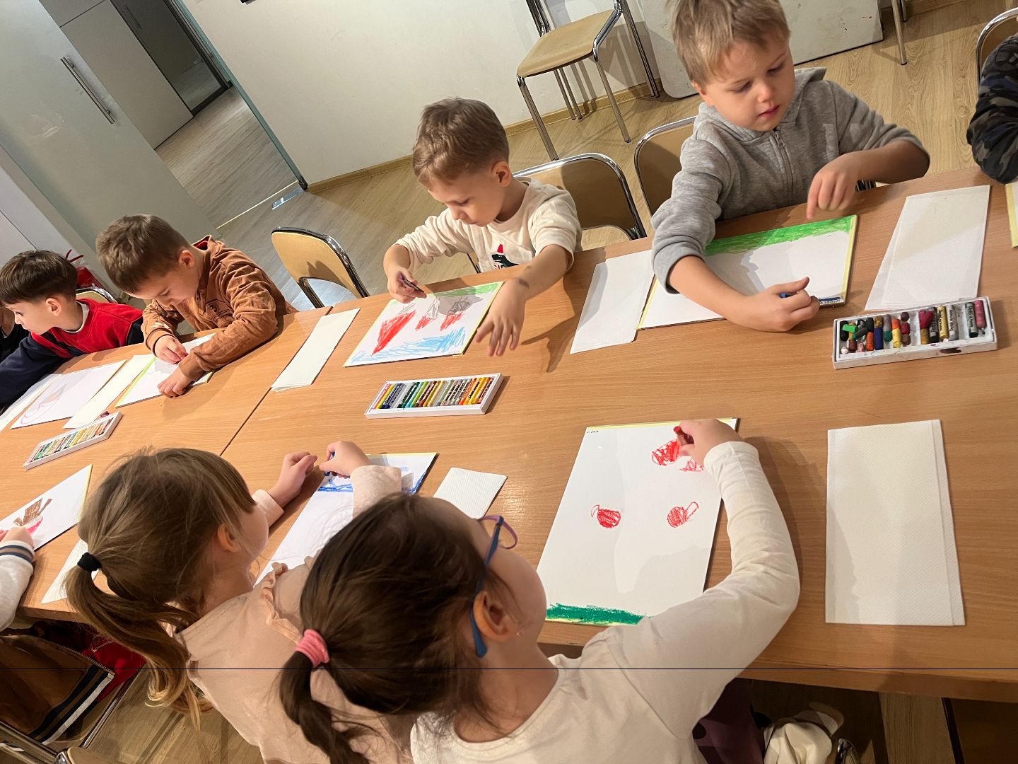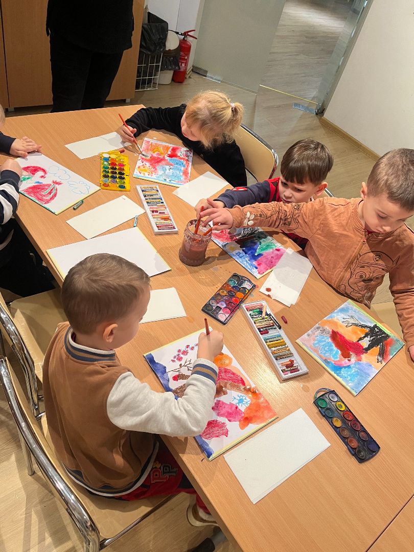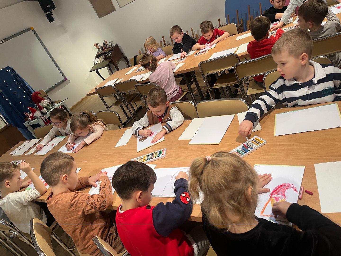 W czwartek dzieci odwiedziły ratusz, gdzie wzięły udział w swoim już trzecim spotkaniu artystycznym. Tym razem poznały, jak powstają pastele oraz farby suche. Po krótkim wprowadzeniu dzieci rozpoczęły pracę twórczą: najpierw rysowały pastelami świąteczne krasnale, a następnie tworzyły tło przy użyciu farb suchych. Powstały ciekawe, zimowe prace, a samo wyjście było dla dzieci okazją do rozwijania nowych umiejętności plastycznych.