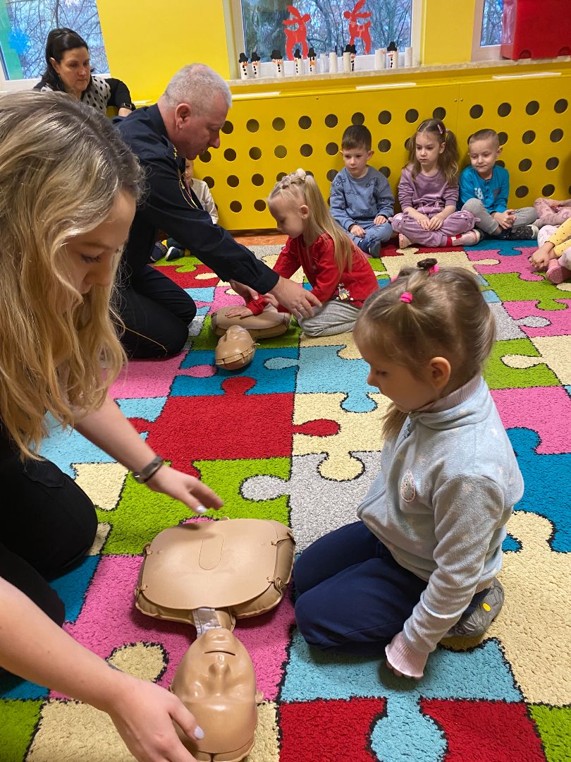 Przedszkolaki miały również możliwość aktywnego udziału w ćwiczeniach praktycznych. Pod okiem strażników ćwiczyły m.in. układanie poszkodowanego w pozycji bocznej bezpiecznej oraz prowadziły podstawowe działania symulujące pomoc koledze lub koleżance. Dodatkowo funkcjonariusze zaprezentowali wyposażenie, którym posługują się podczas interwencji i wyjaśnili jego zastosowanie. Regularne ćwiczenie wiedzy oraz praktycznych umiejętności z zakresu pierwszej pomocy w przedszkolu jest niezwykle ważne ponieważ :