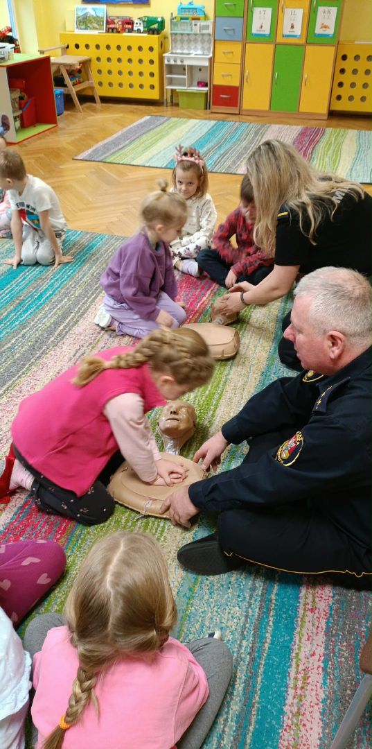 W pierwszym tygodniu grudnia w naszym przedszkolu odbyły się zajęcia profilaktyczno-edukacyjne z zakresu udzielania pierwszej pomocy, prowadzone przez funkcjonariuszy Straży Miejskiej w Białymstoku. W spotkaniu uczestniczyły dzieci z grup starszych wraz z wychowawcami. Celem zajęć było rozwijanie u dzieci podstawowych umiejętności związanych z reagowaniem w sytuacjach zagrożenia zdrowia i życia oraz kształtowanie postawy odpowiedzialności i gotowości do niesienia pomocy. Funkcjonariusze w przystępny, dostosowany do wieku sposób omówili zasady prawidłowego zachowania w sytuacjach nagłych, takich jak utrata przytomności, oparzenia czy skaleczenia.