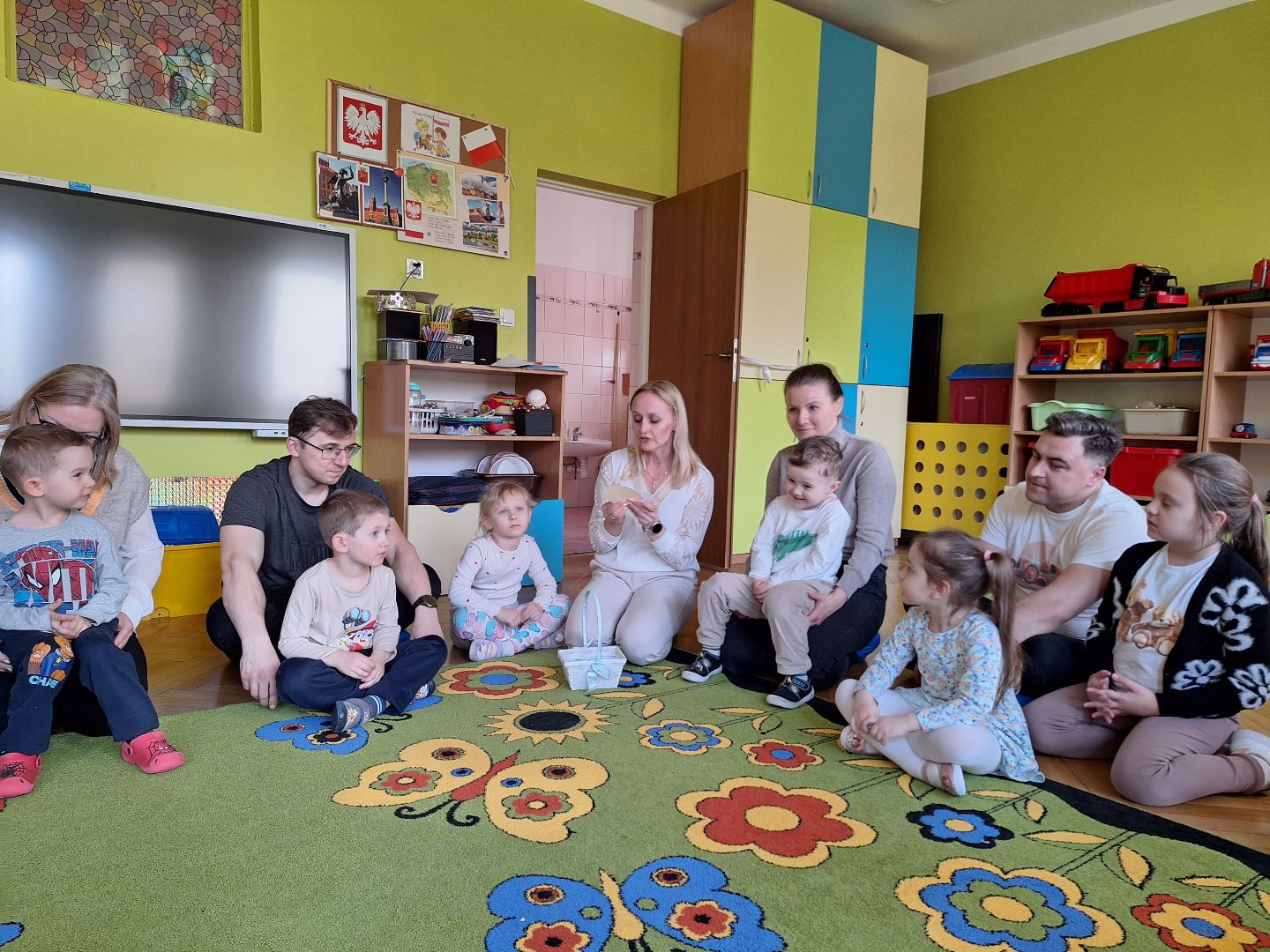 W grupie Puchatków odbyło się zajęcie otwarte z udziałem rodziców. Zajęcia otwarte są jedną z form współpracy z rodzicami. Stanowią okazję do integracji środowiska przedszkolnego zarówno na linii rodzic – wychowawca, jak również integracji wszystkich rodziców dzieci z tej samej grupy przedszkolnej, a także wzmacniania więzi pomiędzy dzieckiem, a rodzicem. Te też doskonała okazja do zobaczenia codziennej pracy z dziećmi oraz możliwość obserwacji zachowań dziecka i jego możliwości i umiejętności na tel grupy. Dzieci od samego rana z wielką niecierpliwością oczekiwały wizyty bliskich. W czasie zajęć związanych ze zbliżającymi się Świętami Wielkanocnymi wspólnie z rodzicami uczestniczyły w zabawach matematycznych i  utrwalały swoją wiedzę na temat tradycji świątecznych. Były więc zagadki, przeliczanie pisanek, układanie pisanki w formie puzzli oraz zabawy ruchowe. Na koniec dzieci wspólnie z rodzicami wykonały barwną pracę plastyczna wykorzystując różne materiały plastyczne. Zabawy i radości było mnóstwo, a najszczęśliwsze tego dnia były dzieci, które mogły z rodzicami i innymi bliskimi przyjemnie spędzić czas w przedszkolu.