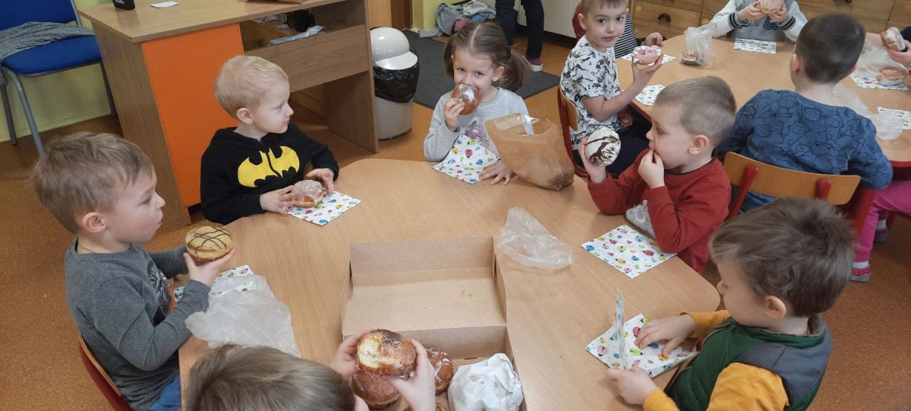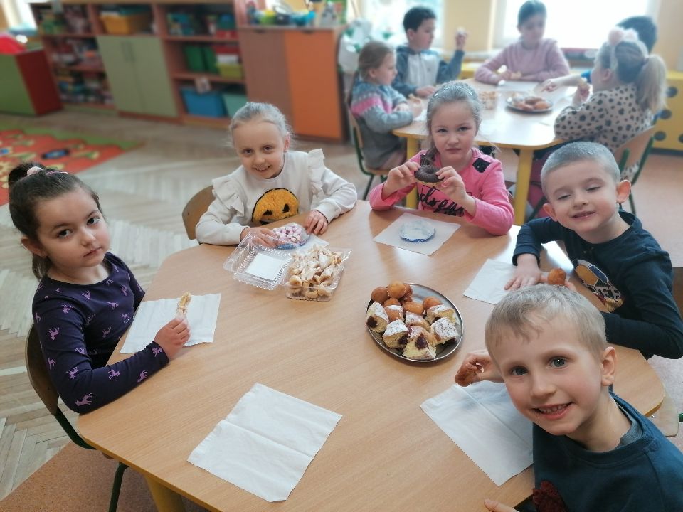 Zgodnie z tradycją w „Tłusty czwartek” każdy powinien zjeść pączka. Tak też i było w naszej grupie. Dzieci poznały historie pączka i zwyczaj obchodzenia „Tłustego czwartku”. Słuchaliśmy wierszyków związanych z tym świętem. Dzieci obejrzały teatrzyk „Pączki i faworki i babci Honorki” oraz krótki skecz przygotowany przez przedszkolny kabaret.