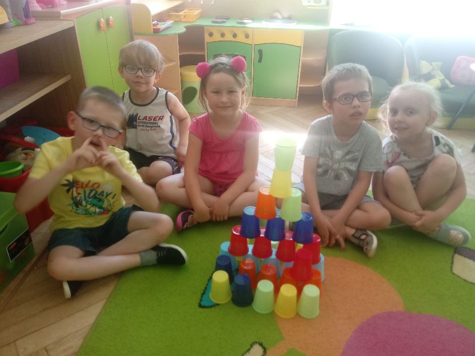 Kodowanie na dywanie-zabawy z kolorowymi kubeczkami. Nauka przez zabawę ,dzieci zadowolne, cel osiągnięty elementy kodowania wprowadzone!