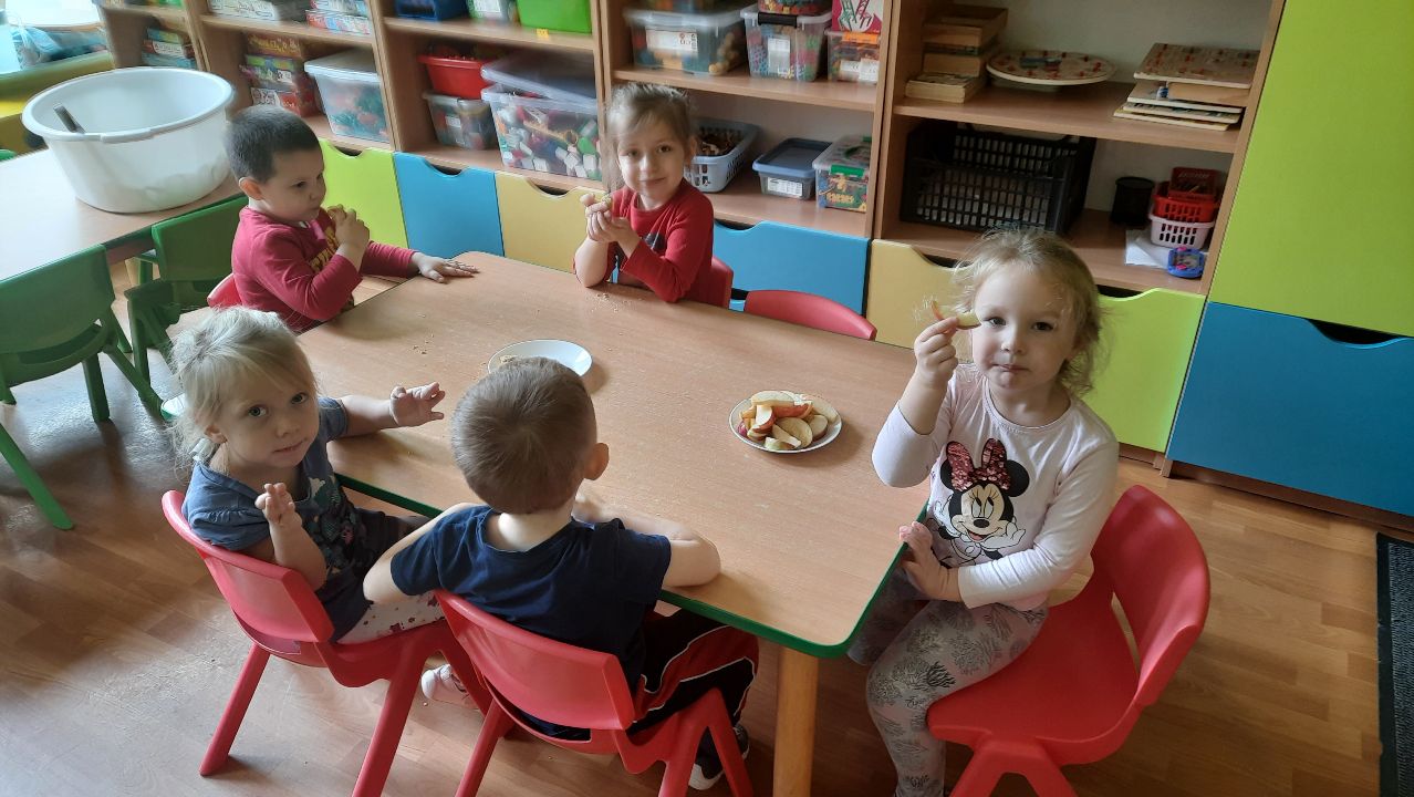Pieczenie ciasta, to nie taka trudna sprawa, Szczegółnie, gdy do pomocy jest tyle małych i zdolnych rąk. Według przepisu Kłapouszki przygotowały składniki: mąkę, cukier, jaja, olej, proszek do pieczenia oraz jabłka. Zmieszaliśmy składniki i włożyliśmy ciasto do rozgrzanego piekarnika. Kiedy ciasto było gotowe odbyła się wspólna degustacja.