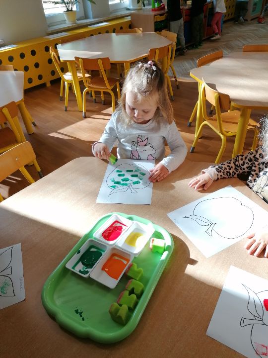 W bieżącym tygodniu "Maleństwa" poznają owoce: jabłka, gruszki, śliwki; dzieci określały kolor owoców oraz poznawały ich smak.Wykonały pracę plastyczną- stemplowanie konturów owoców gąbką maczaną w farbie.