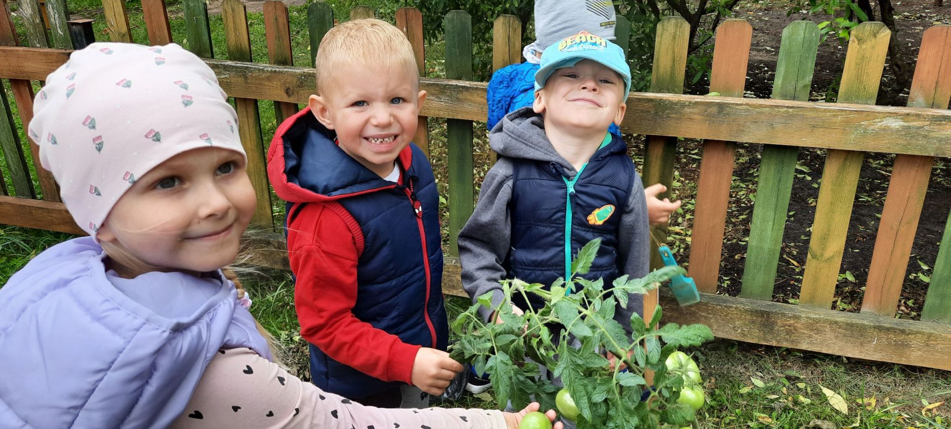 Wiosną przedszkoli założyły w przygotowanych wcześniej drewnianych donico – grządkach przedszkolnym ogródek, w którym pod okiem studentek z Wydziału Architektury Krajobrazu PB zasiały m.in. marchew, buraki, pietruszkę, dynię, słonecznik, ziemniaki, pomidorki. Głównym powodem założenia ogródka, była chęć kształtowania u dzieci postawy ekologicznej poprzez zastosowanie tej atrakcyjnej formy edukacji. Pragnęliśmy aby dzieci mogły uzyskać wiedzę o etapach rozwoju i warunkach życia roślin i obserwować zmiany zachodzące w wyglądzie roślin w ciągu roku. Chcieliśmy by dzieci nauczyły się posługiwania się prostymi narzędziami ogrodniczymi i wyrobiły w sobie nawyk systematycznego pielęgnowania roślin w ogródku, czego uhonorowaniem miało być zbieranie plonów i degustowanie ich podczas posiłków przedszkolnych. Zależało nam, aby dzieci miały miały praktyczną możliwość poznania różnorodnych gatunków roślin występujących w ogrodzie – ziół, kwiatów, warzyw i owoców – i nauczenia się je rozpoznawać i prawidłowo nazywać. Nadeszła jesień i czas zobaczyć jak pięknie wszytko urosło. Kolorowe słoneczniki widać już daleka. Czerwone pomidorki czy marchewki można schrupać zaraz po umyciu. Taki ogródek to świetna sprawa!!!!