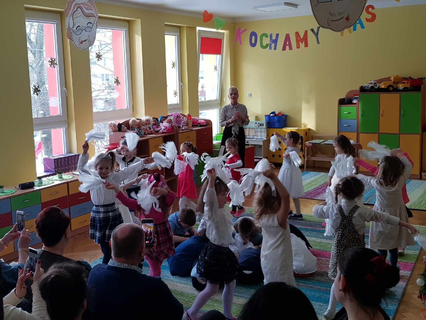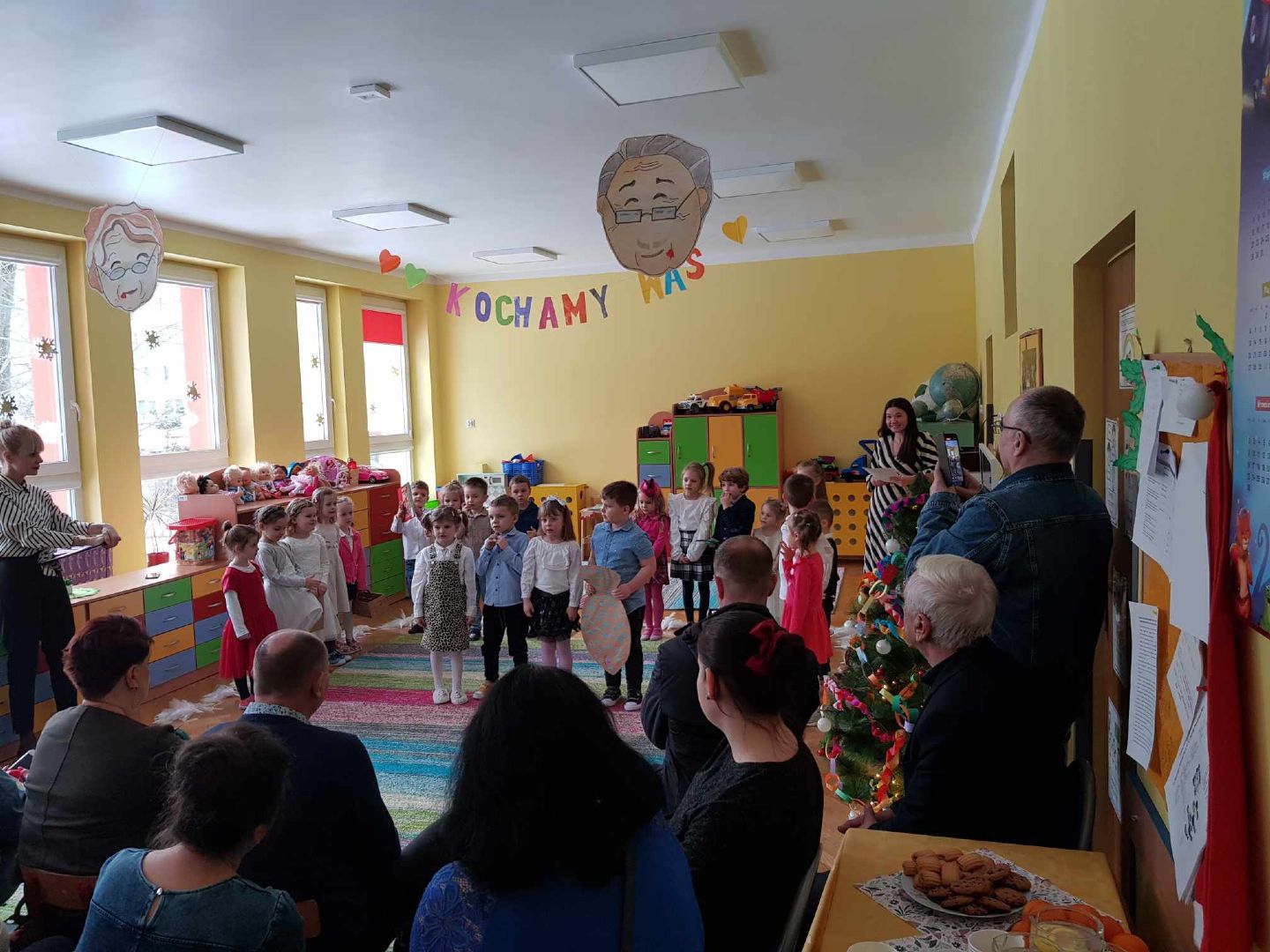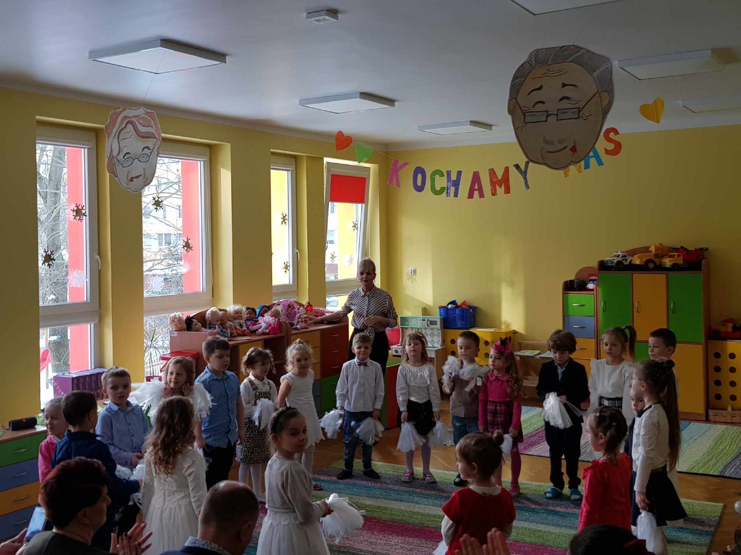 Dziś odbyła się uroczystość z okazji dnia Babci i Dziadka w grupie Króliczków. Frekwencja gości przybyłych na występ przedszkolaków potwierdziła przekonanie, że " wnuki kocha się bardziej niż dzieci". Licznie zgromadzeni Dziadkowie króliczków obejrzeli występ oraz wzięli udział we wspólnych tańcach a na koniec otrzymali prezenty od wnuków.