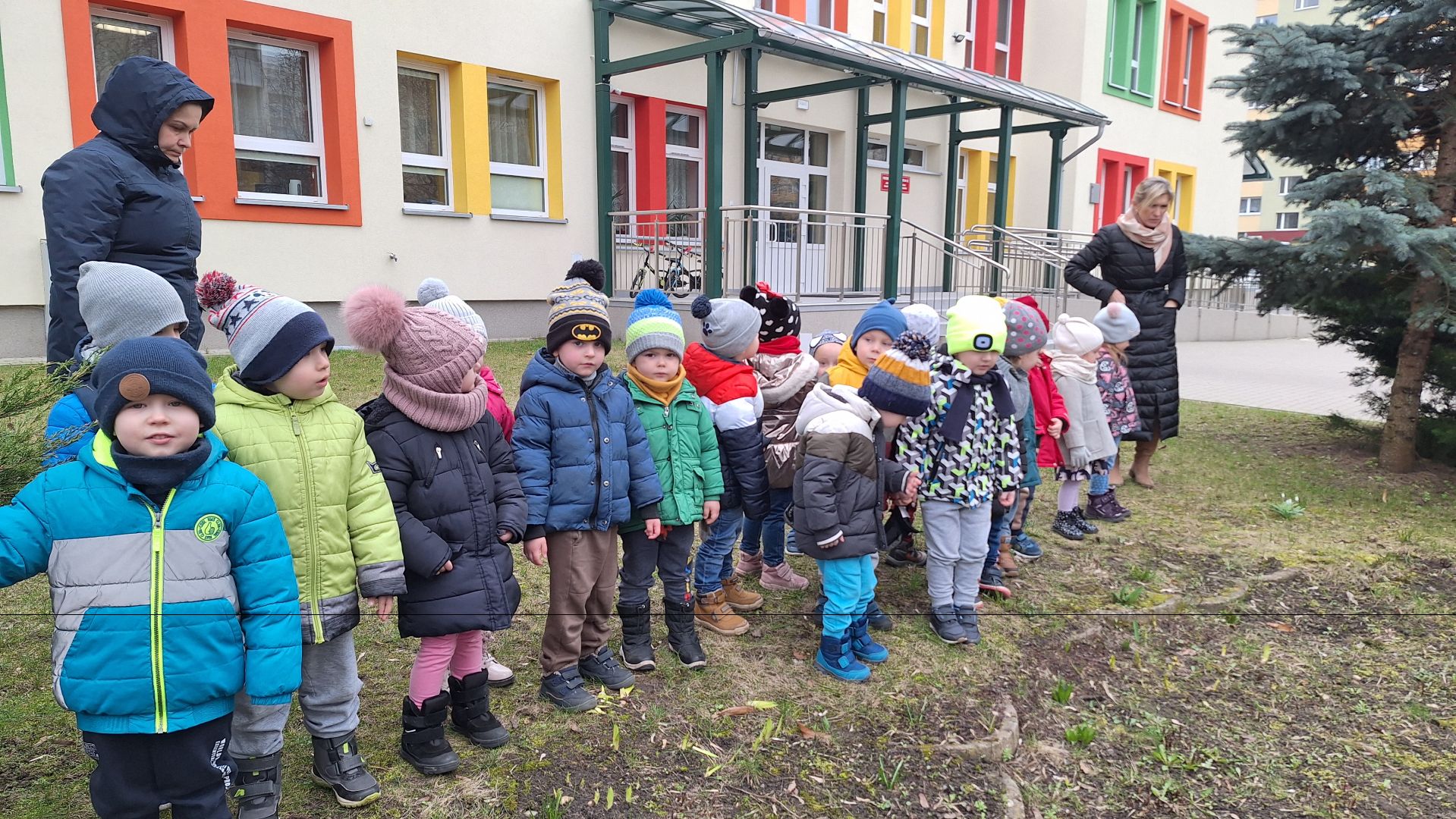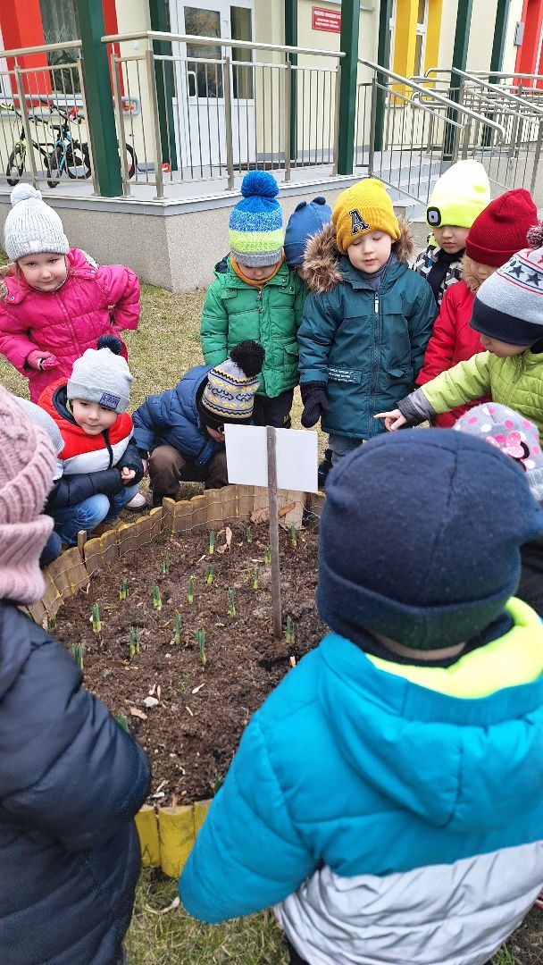 Korzystając z ładnej pogody Maleństwa wybrały się na spacer do ogrodu przedszkolnego w poszukiwaniu wiosny. Spacerując przedszkolaki wsłuchiwały się w śpiew ptaków,wypatrywały w konarach drzew gniazd, oglądały z bliska pąki pojawiające się na drzewach i krzewach, wyszukiwały w trawie wiosenne kwiaty i rośliny. Okazało się iż w przedszkolnym ogrodzie rosną przebiśniegi, kolorowe krokusy a już niedługo wyrosną tulipany i żonkile. Po spacerze dzieci w iście „wiosennych” humorach bawiły się na podwórku.