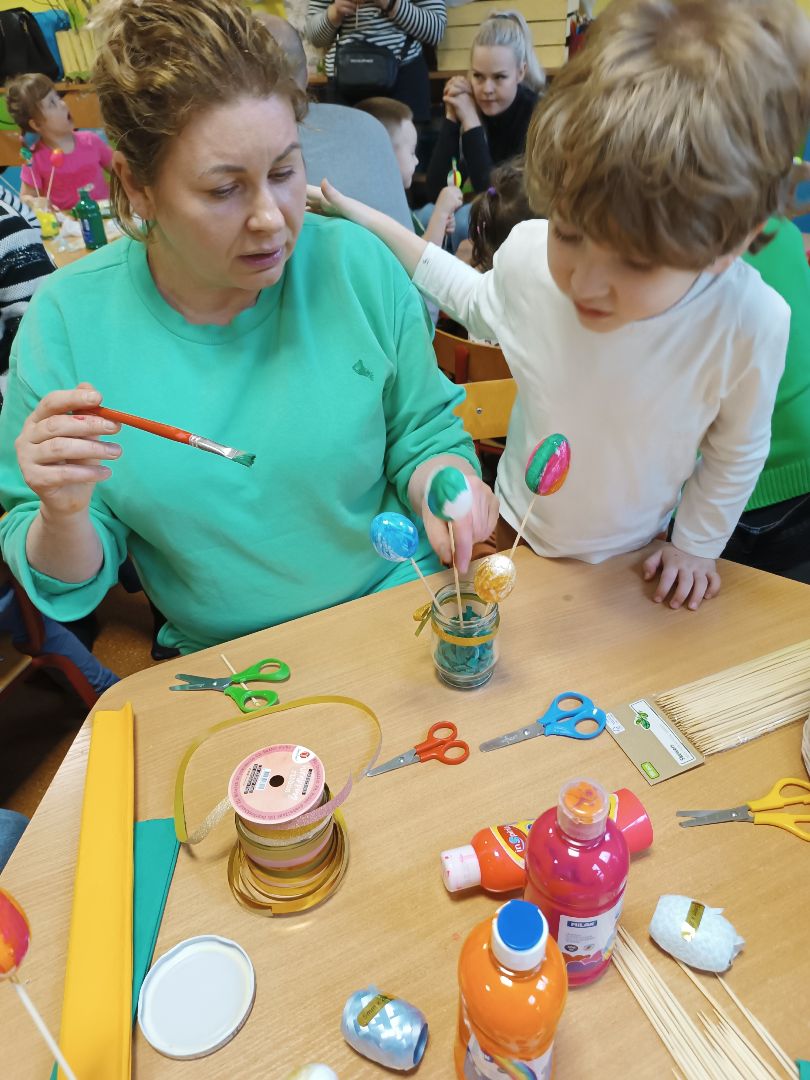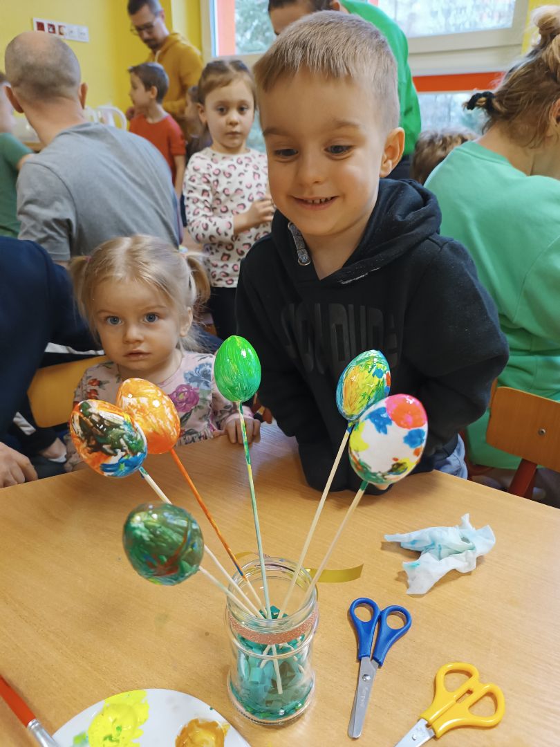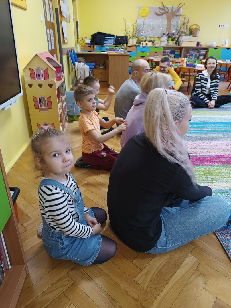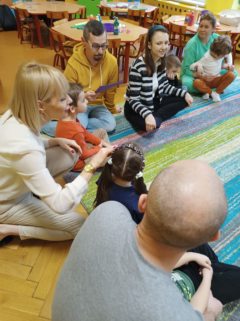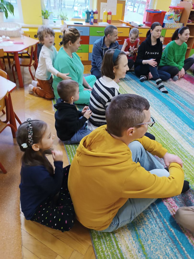 Dzieci z Rodzicami stworzyły piękne stroiki wielkanocne a na koniec wszyscy bawiliśmy się z wykorzystaniem chusty animacyjnej.