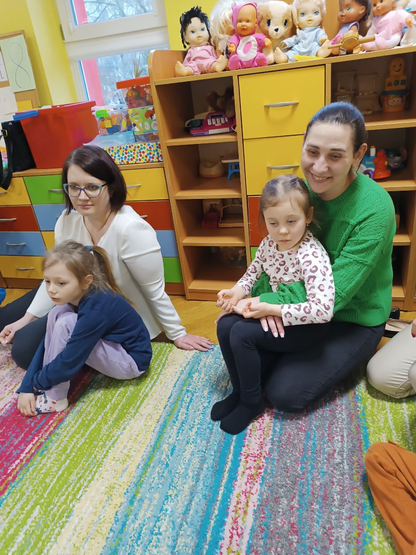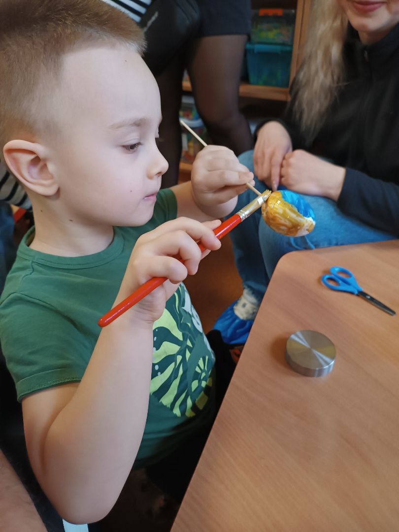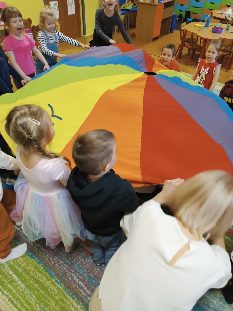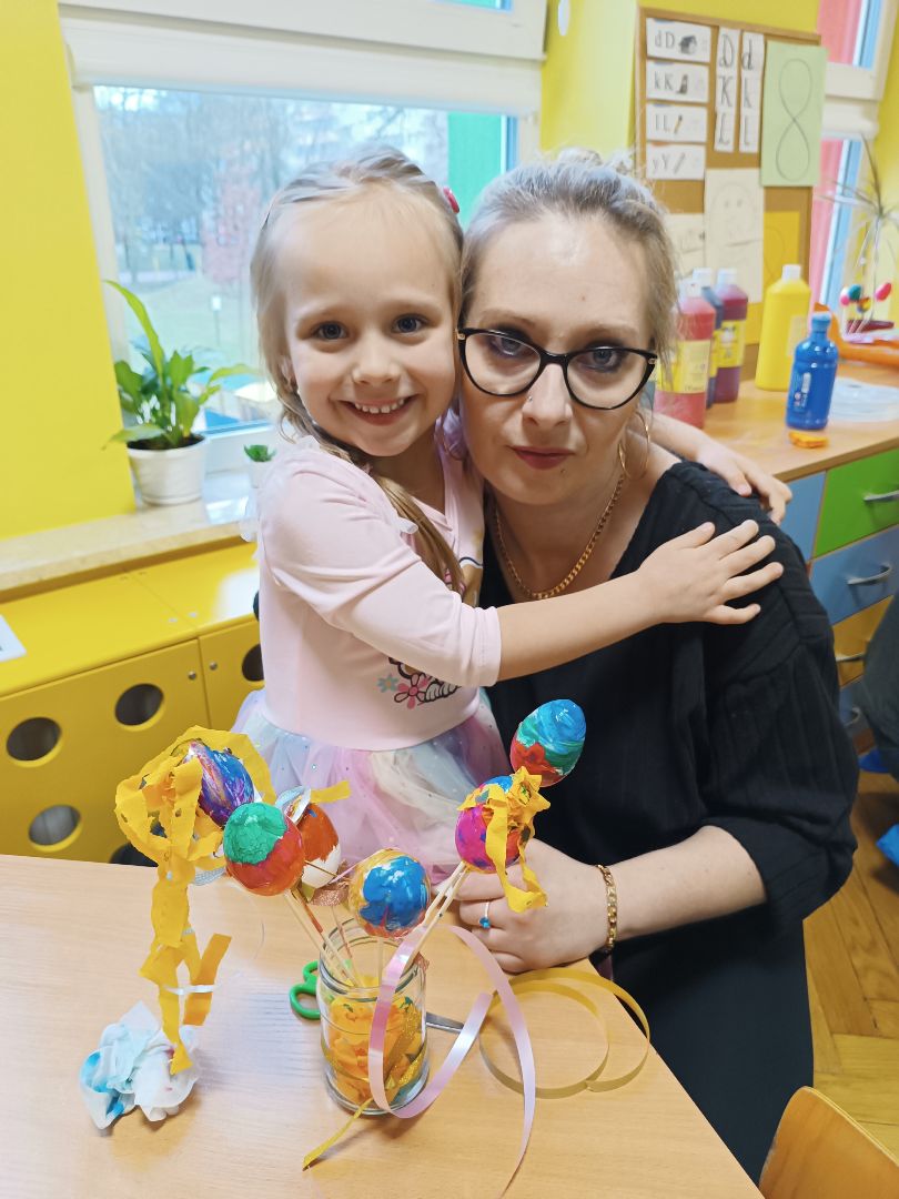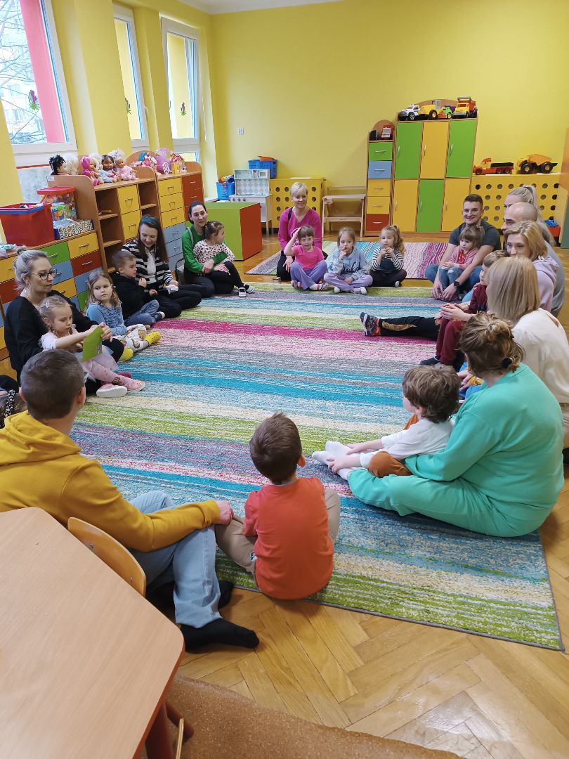 Dzieci z Rodzicami stworzyły piękne stroiki wielkanocne a na koniec wszyscy bawiliśmy się z wykorzystaniem chusty animacyjnej.