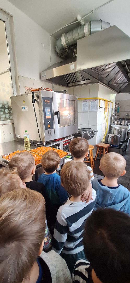 W ramach tygodnia pod hasłem; "Kto pracuje w przedszkolu?" dzieci z grupy Puchatków zwiedziły przedszkolną kuchnię i poznały pracę pań kucharek. Miały możliwość z bliska obserwować pracę jaką wykonują panie w kuchni. Dzieci poznały kuchenne wyposażenie, rozpoznawały i nazywały znajdujące się tam urządzenia i akcesoria kuchenne potrzebne paniom kucharkom w codziennym przygotowaniu pysznych i zdrowych posiłków dla wszystkich przedszkolaków. Panie kucharki przybliżyły dzieciom zasady bezpiecznego korzystania z kuchennych urządzeń. Zwrócono uwagę również na strój jaki mają panie przy pracy. Przedszkolaki dzięki wizycie dowiedziały się co będzie na obiad i obiecały zjeść wszystko ze smakiem ( i tak było!). Dziękujemy paniom z kuchni za miłe przyjęcie.