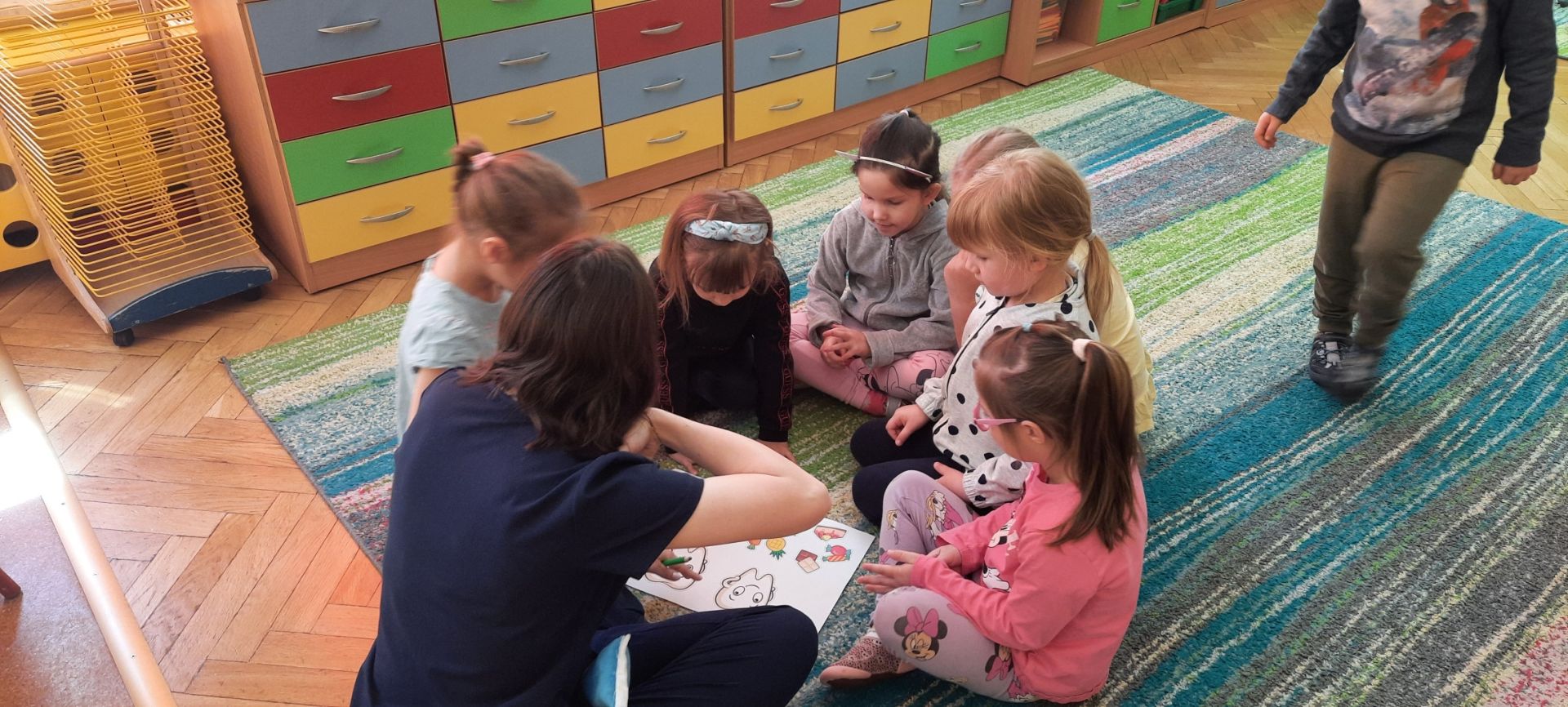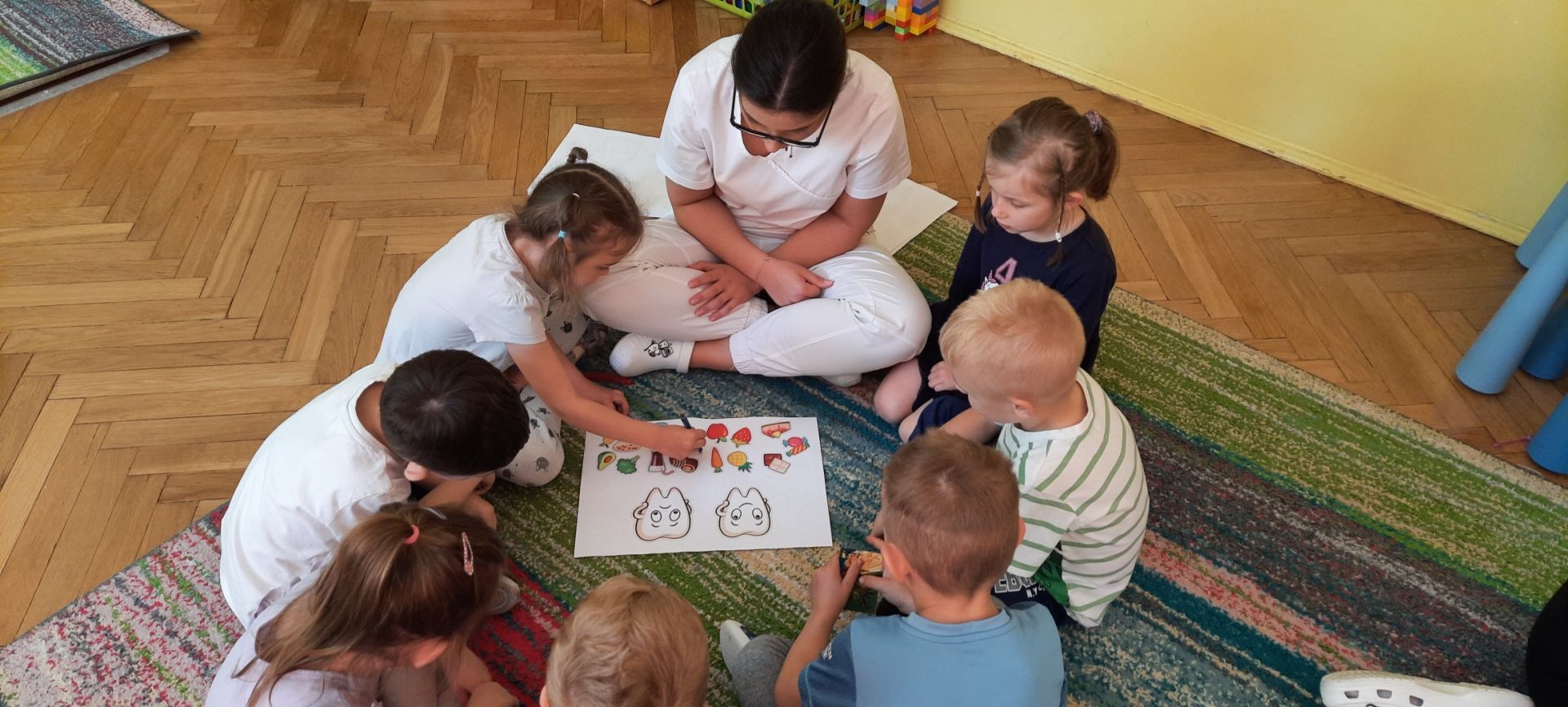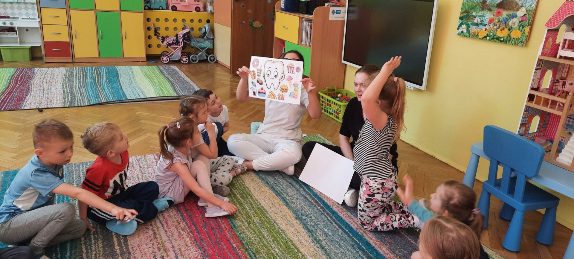W dniu dzisiejszym w naszym przedszkolu gościliśmy panie – studentki II roku stomatologii, które przygotowały i przeprowadziły ciekawe zajęcia dydaktyczne na temat prawidłowego mycia zębów. Dzieci miały okazję dowiedzieć się, dlaczego codzienna higiena jamy ustnej jest tak ważna oraz jak prawidłowo szczotkować zęby. Studentki zaprezentowały odpowiednie techniki mycia zębów, wykorzystując kolorowe pomoce dydaktyczne, modele szczęki oraz zabawne ilustracje, które w przystępny sposób przybliżyły dzieciom temat dbania o zdrowy uśmiech. Zajęcia były bardzo interesujące i dostosowane do wieku dzieci. Poprzez zabawę, piosenki i interaktywne zadania maluchy nie tylko dobrze się bawiły, ale także zdobyły cenną wiedzę. Spotkanie to z pewnością przyczyni się do kształtowania prawidłowych nawyków higienicznych wśród najmłodszych. Dziękujemy studentkom za zaangażowanie i serdeczną atmosferę!.