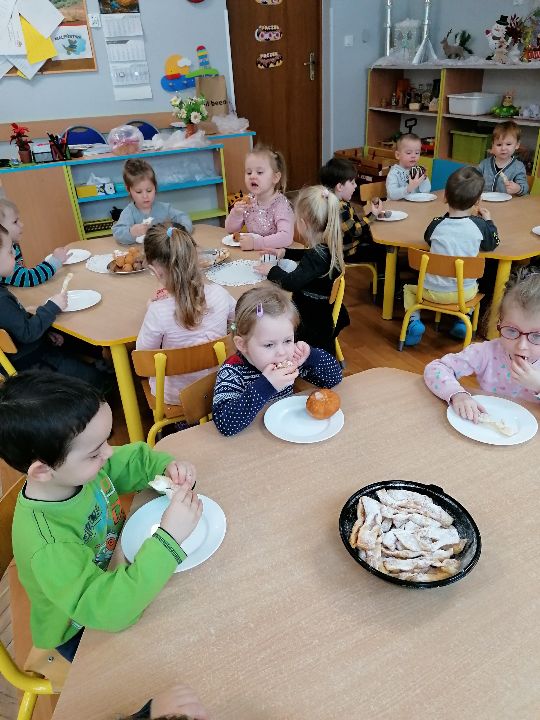 Zgodnie z tradycją w „Tłusty czwartek” każdy powinien zjeść pączka. Tak też i było w naszej grupie. Dzieci poznały historie pączka i zwyczaj obchodzenia „Tłustego czwartku”. Słuchaliśmy wierszyków związanych z tym świętem. Dzieci obejrzały teatrzyk „Pączki i faworki i babci Honorki” oraz krótki skecz przygotowany przez przedszkolny kabaret.