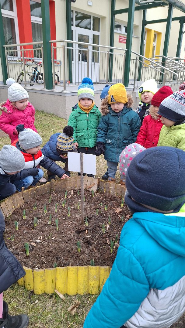Korzystając z ładnej pogody Maleństwa wybrały się na spacer do ogrodu przedszkolnego w poszukiwaniu wiosny. Spacerując przedszkolaki wsłuchiwały się w śpiew ptaków,wypatrywały w konarach drzew gniazd, oglądały z bliska pąki pojawiające się na drzewach i krzewach, wyszukiwały w trawie wiosenne kwiaty i rośliny. Okazało się iż w przedszkolnym ogrodzie rosną przebiśniegi, kolorowe krokusy a już niedługo wyrosną tulipany i żonkile. Po spacerze dzieci w iście „wiosennych” humorach bawiły się na podwórku.