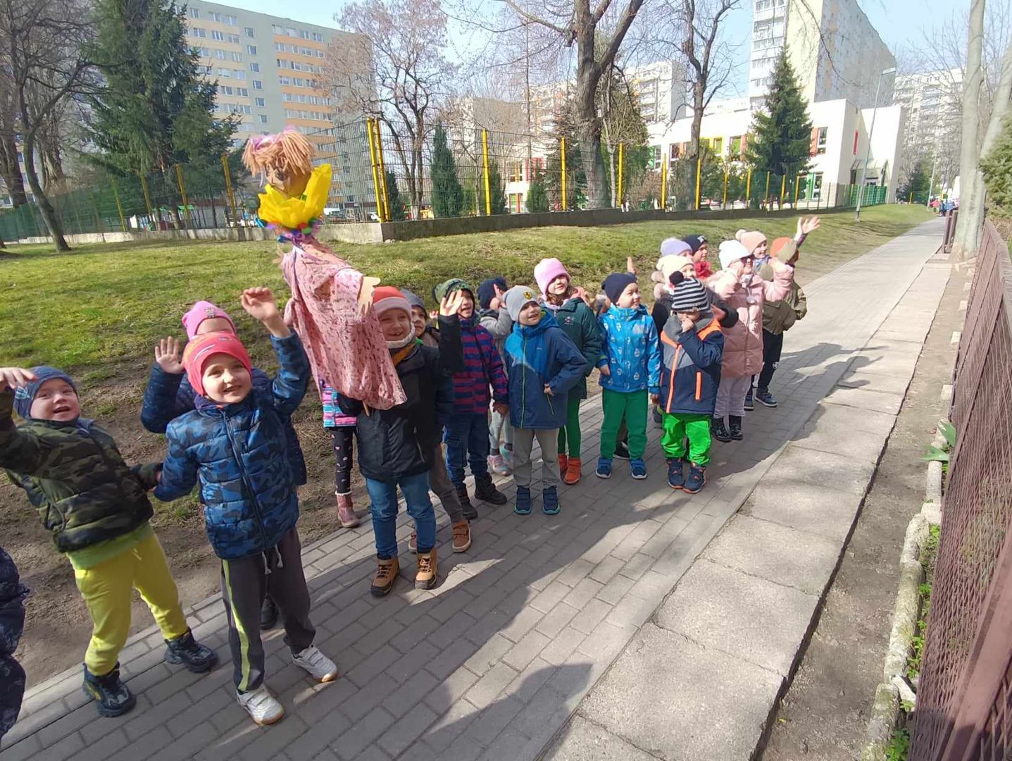 21.03.2024 w naszym przedszkolu obchodziliśmy 1 Dzień Wiosny. Wszystkie przedszkolaki ubrały się w dniu dzisiejszym na zielono aby zaakcentować i manifestować Wiosnę. Dzień ten rozpoczęliśmy od przedstawienia obrazkowego pt. „Jak bałwanek witał wiosnę”, które przygotowały nauczycielki. Następnie porozmawialiśmy o tradycji jaką jest Marzanna i Gaik. Do przedszkola dotarł list od Pani Wiosny, który został odczytany na forum - przedszkolaki były podekscytowane zadaniami postawionymi przed nimi przez Panią Wiosnę, gdyż manifestując jej przyjście musiały zaśpiewać piosenkę „Pani Wiosna”. Gdy już Pani Wiosna dotarła do naszego przedszkola, dzieciaki były przeszczęśliwe. Wiosna zadawała dzieciom zagadki, a one w mig je rozwiązywały. Ostatnim punktem naszego świętowania 1 Dnia Wiosny było, pochód wokół przedszkola. ze „słomianą kukłą – Marzanną” wykonaną wcześniej na zajęciach. Powrót do przedszkola był już z Gaikiem. W trakcie przemarszu dzieci śpiewały piosenki o tematyce zimowej i wiosennej. Mogły też zaobserwować pierwsze oznaki wiosny. Kolorowy pochód zakończył się na placu przedszkolnym, gdzie miejsce Marzanny zajmie zielony, barwny gaik, z którym dzieci powróciły do placówki.