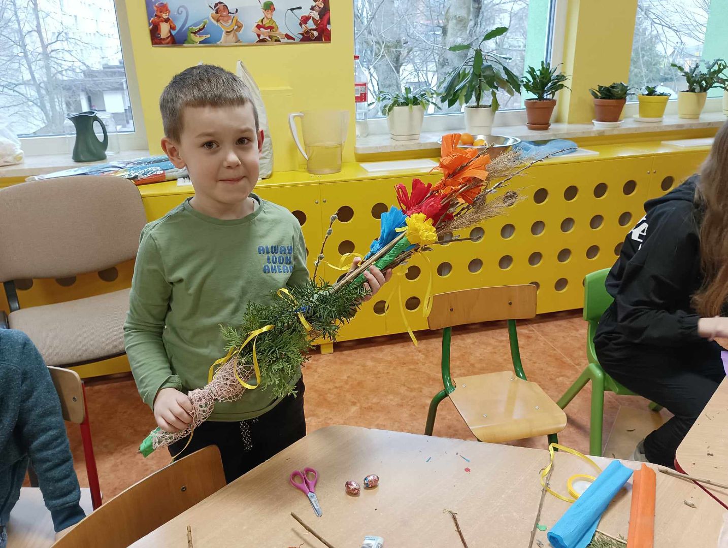 22 marca w grupie V „Kłapouszki” odbyły się warsztaty z rodzicami pt. „Wielkanocna palma”. Rozpoczęliśmy od zaprezentowania rodzicom piosenki „Pani Wiosna”, następnie rozwiązaliśmy wspólnie krzyżówkę wielkanocną. Płynnie przeszliśmy do głównego punktu spotkania, a więc do przygotowania wielkanocnych palm. Małe i duże „dzieła sztuki” wychodziły z rąk dzieci i rodziców. Rodzice z dziećmi, wierzbowe bazie przystrajali bukszpanem, trawą pampasową, kolorowymi kwiatami i kolorowymi wstążkami. Spędziliśmy miło czas w gronie najbliższych, rodzice mieli okazję do bezpośredniej obserwacji dziecka podczas zajęć oraz na tle grupy. To spotkanie było również, wzmacnianiem więzi rodzinnych.