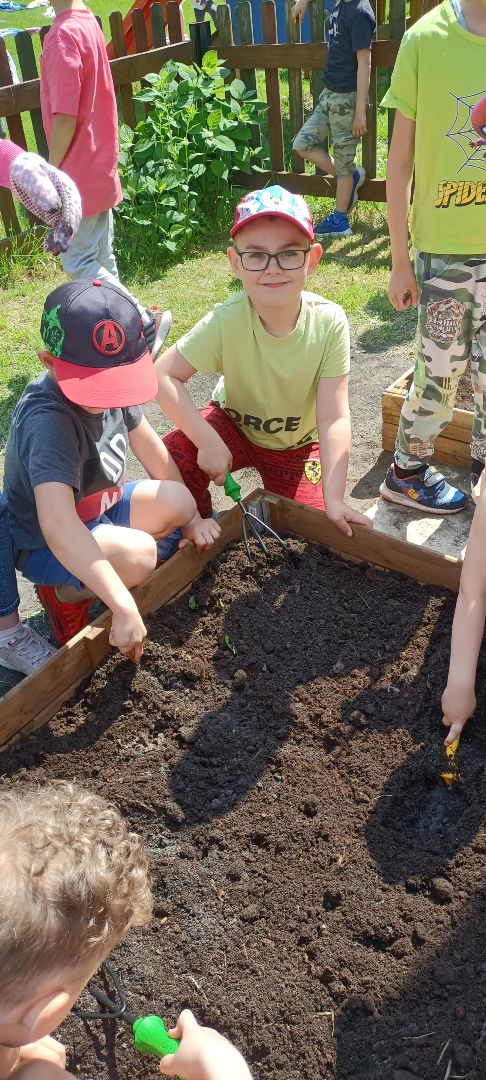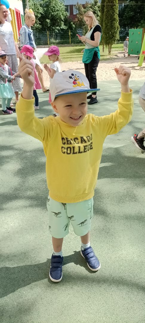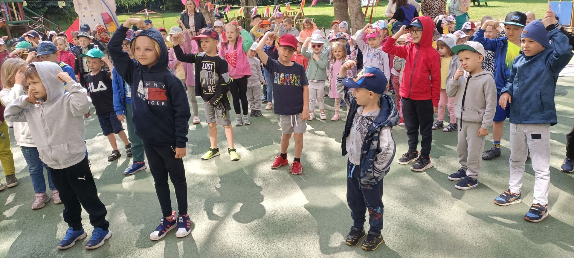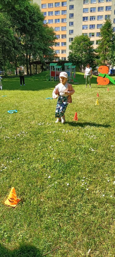 Zabawy animacyjne na placu przedszkolnym prowadzone przez grupę teatralną „ Orzełek”.
