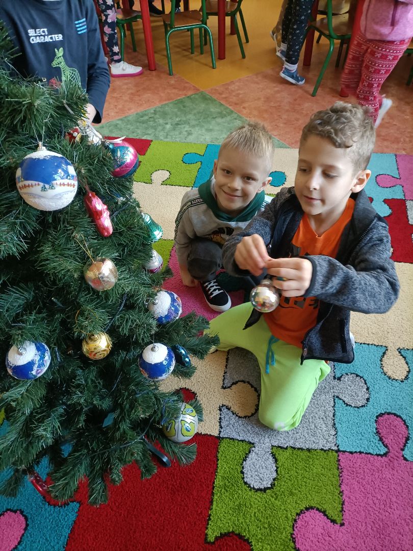 Czas Świąt Bożego Narodzenia wiąże się z tradycją ubierania choinki. W naszej grupie nie mogło zabraknąć tego zwyczaju. Wspólnie zawieszaliśmy bombki, gwiazdki i kolorowe światełka. Choinka wygląda prześlicznie, a dzięki niej w naszej sali od razu zrobiło się świątecznie i wyjątkowo!
