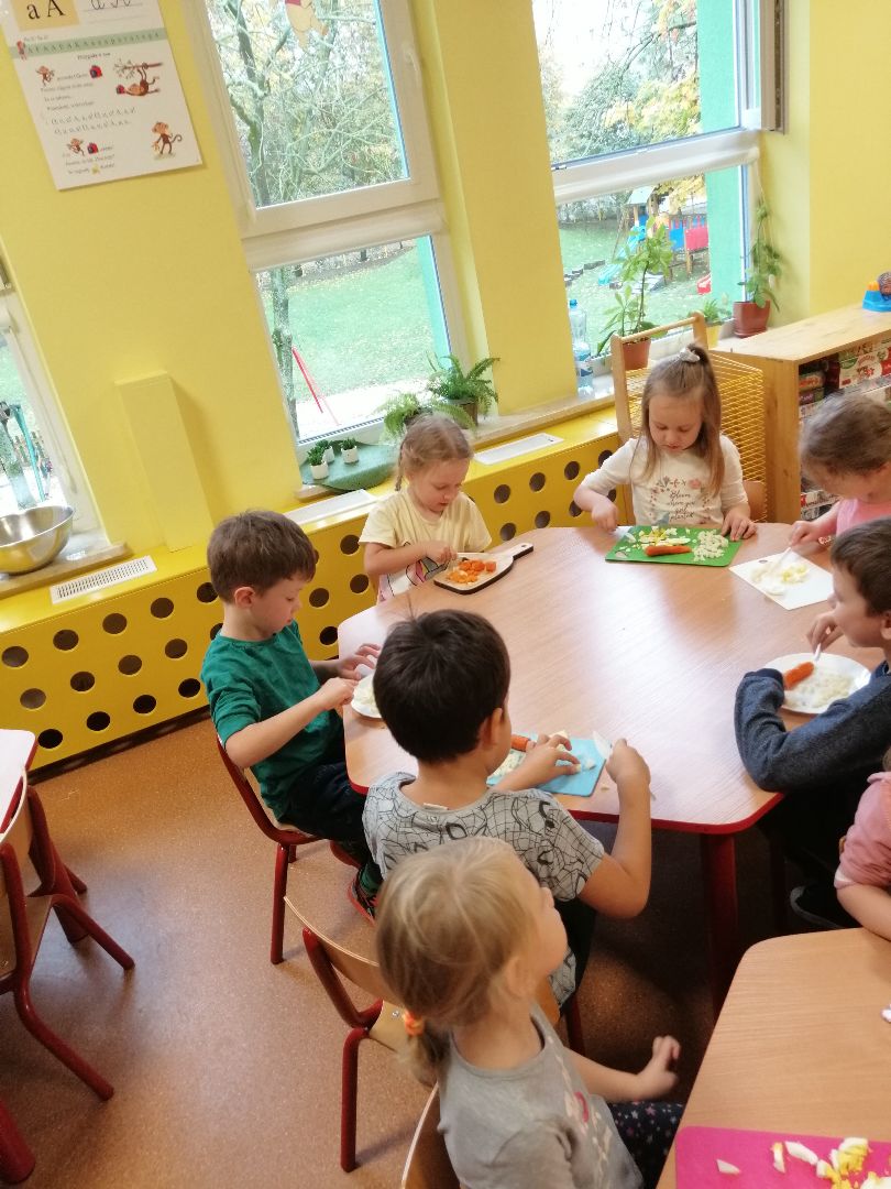 21 października obchodziliśmy w naszych grupach Światowy Dzień Warzyw i Owoców. Głównym celem zajęć było zachęcenie dzieci do spożywania warzyw i owoców. Przedszkolaki obejrzały inscenizacje wiersza ,,Na straganie''. Wspomniane święto było też okazją do stworzenia owocowo-warzywnego soku. Włączenie dzieci do przygotowywania posiłków jest świetnym sposobem, aby wspólnie spędzać czas. Zarówno produkcja jak i konsumpcja soku wyszła dzieciom doskonale. Zachęcamy wszystkich, aby świętować każdego dnia- jedząc warzywa i owoce bogate w witaminy.