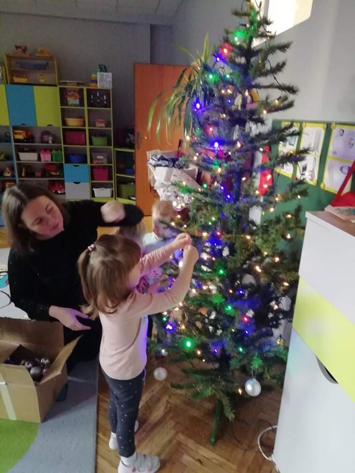 W ostatnich dniach nasze przedszkolaki przypominały sobie tradycję ozdabiania świątecznego drzewka. Dzień ubierania choinki w przedszkolu jest dniem wyjątkowym. Dzieci z wielkim zaangażowaniem zawieszają ozdoby, a gdy nasze wspólne drzewko jest już ubrane wszyscy wiedzą, że święta są tuż, tuż…
