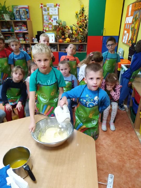 Pieczenie ciasta, to nie taka trudna sprawa, Szczegółnie, gdy do pomocy jest tyle małych i zdolnych rąk. Według przepisu Kłapouszki przygotowały składniki: mąkę, cukier, jaja, olej, proszek do pieczenia oraz jabłka. Zmieszaliśmy składniki i włożyliśmy ciasto do rozgrzanego piekarnika. Kiedy ciasto było gotowe odbyła się wspólna degustacja.