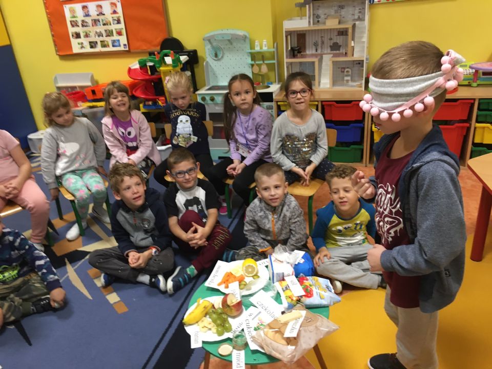 Na zajęciu dzieci poznały zmysły dzięki którym poznajemy świat- wzrok, słuch, smak, dotyk, węch.